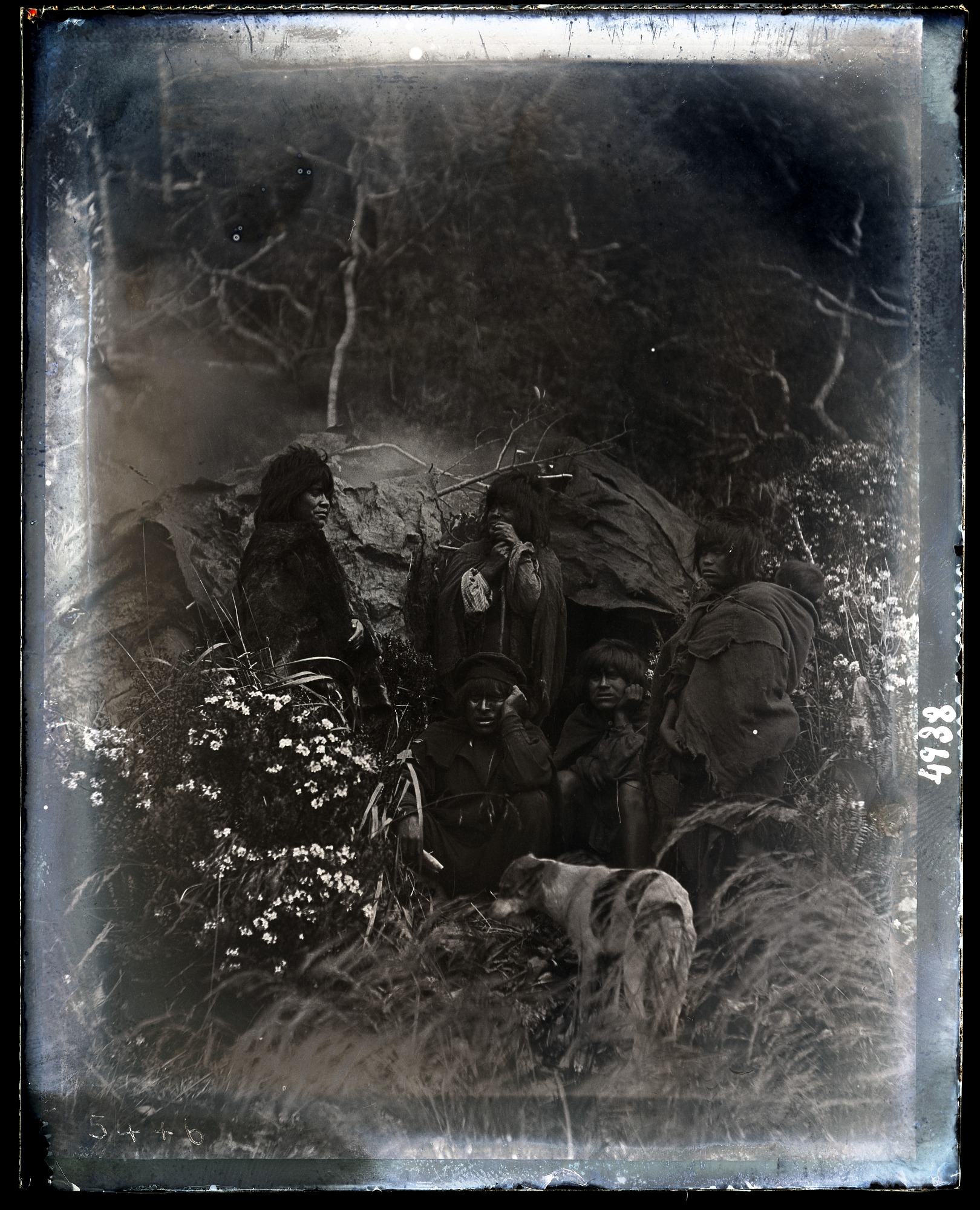 Group portrait of Fuegians at Otter Bay, Straits of Magellan.