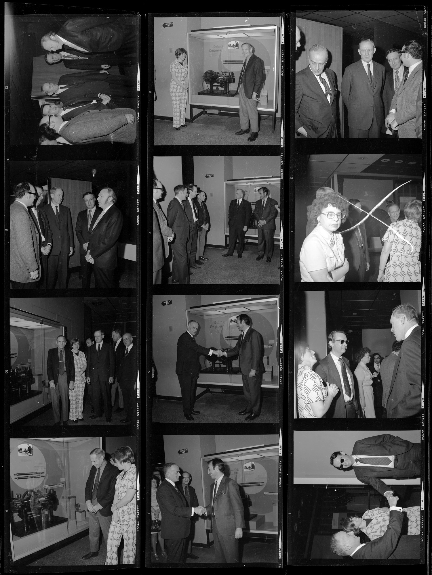 Donors from Johns Hopkins University (JHU) visit exhibit featuring "Ruling Engines" invented by Henry Augustus Rowland, professor of physics at JHU, in the Hall of Physical Sciences at the National Museum of History and Technology (NMHT), now known as the National Museum of American History, with Silvio A. Bedini, Deputy Director of NMHT.