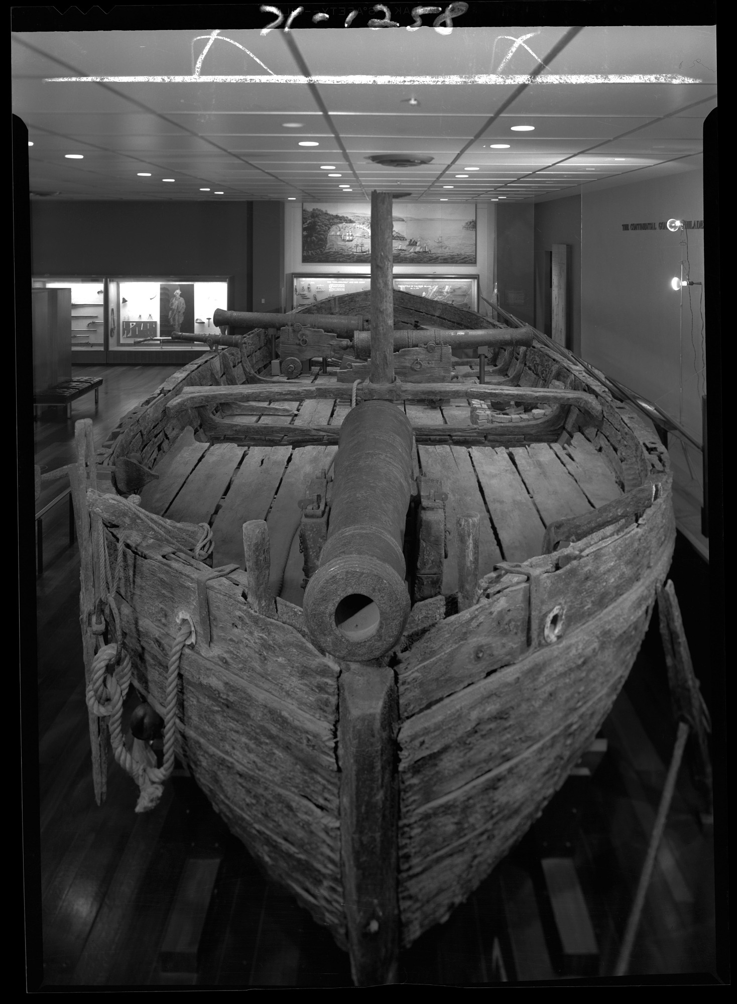 Gunboat "Philadelphia" [AF.58888-N(1)] in exhibit hall featuring military history at National Museum of History and Technology (NMHT).