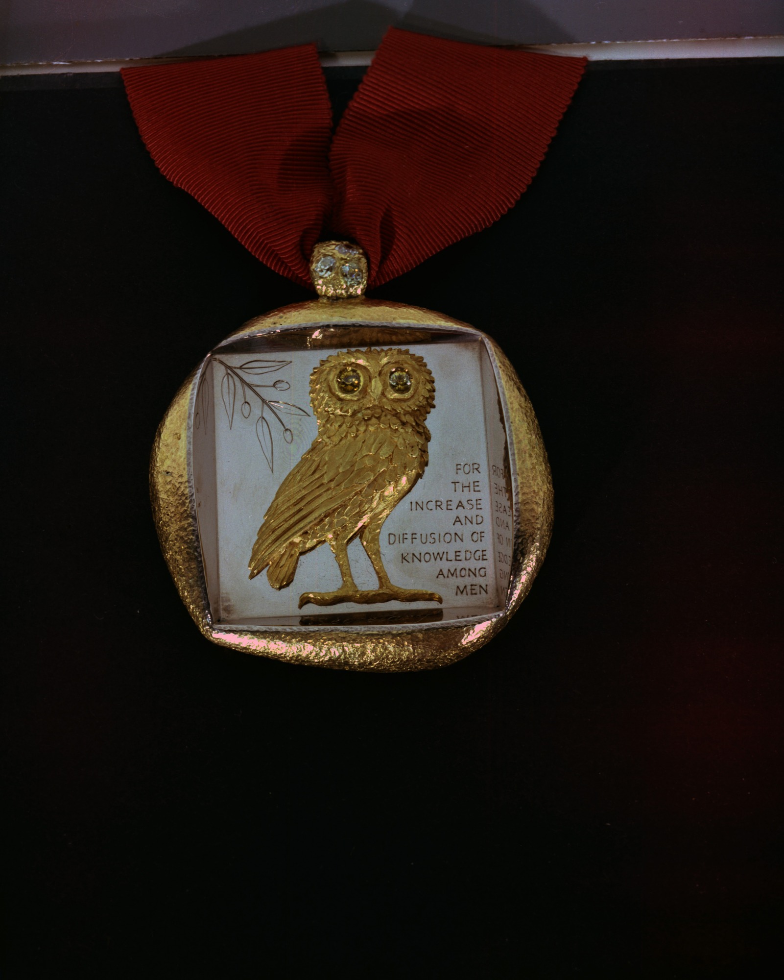 Gold owl pendant and inscription, "For the Increase and Diffusion of Knowledge Among Men."