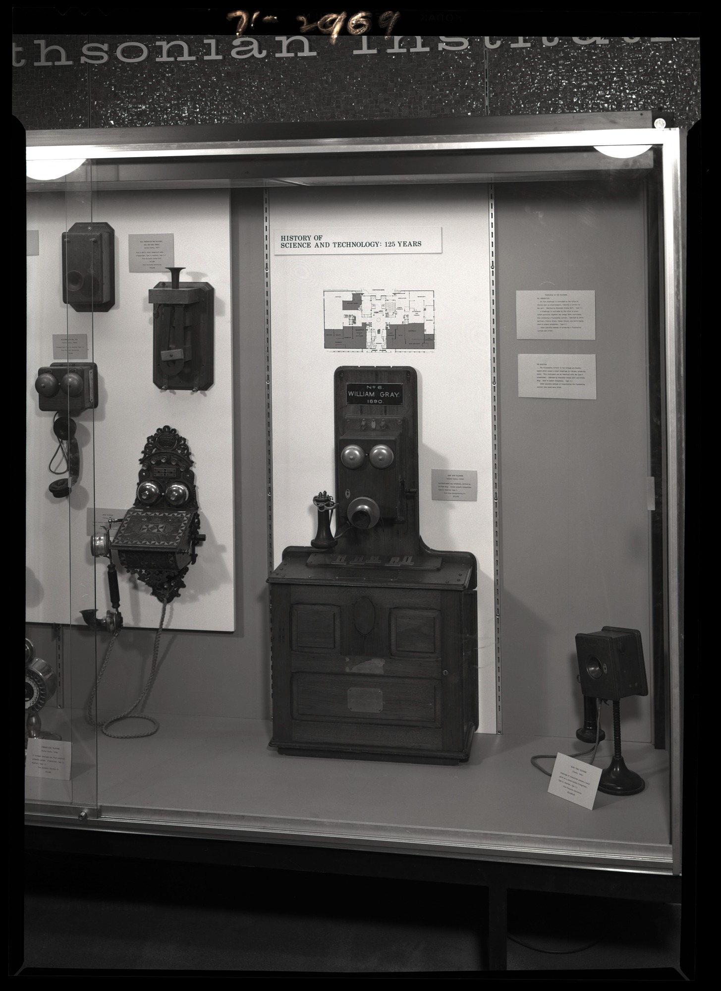 Monthly exhibit case in the lobby of the National Museum of History and Technology, now known as the National Museum of American History, featuring telephones in the "History of Science and Technology" case.