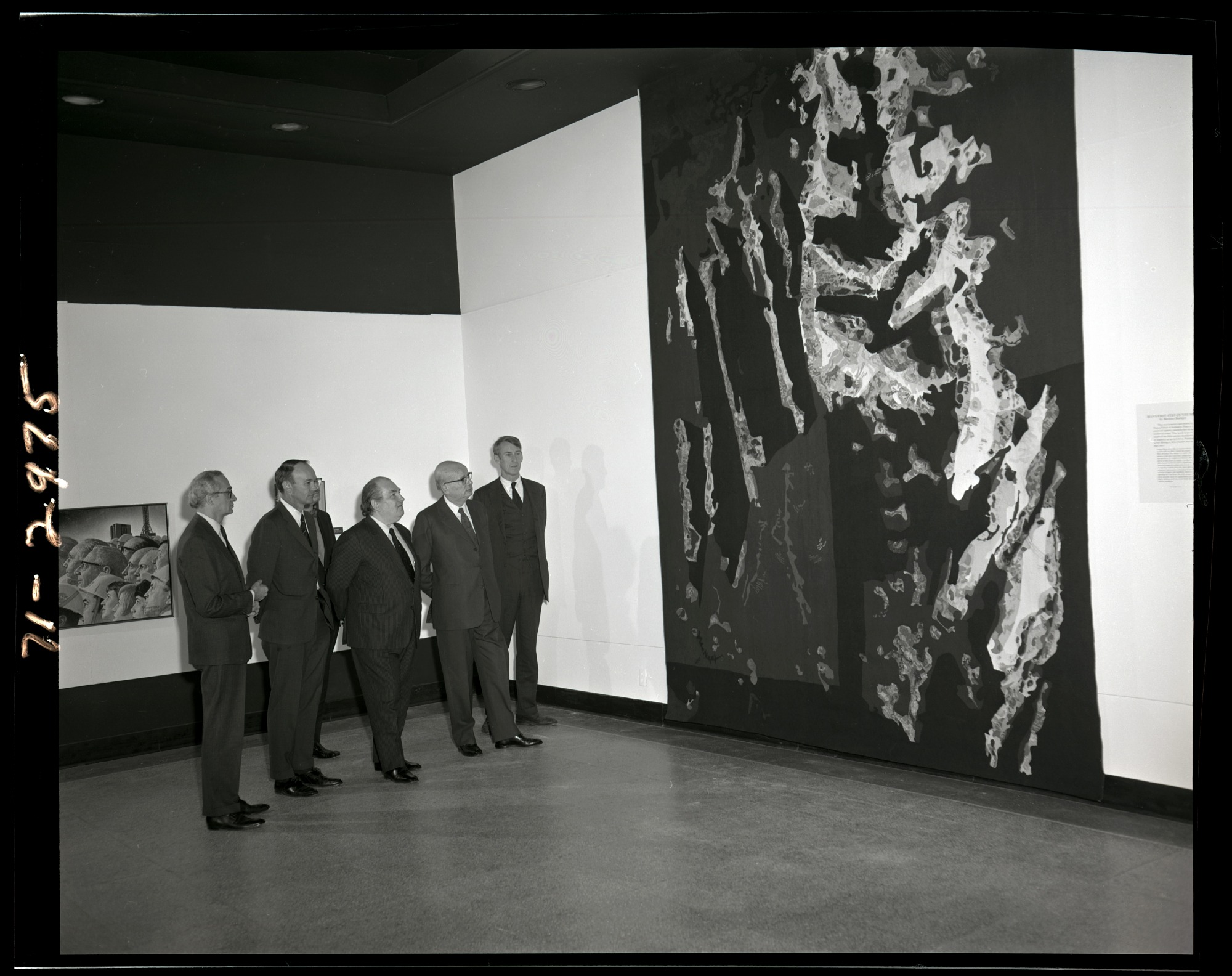 Gift of the Ministry of Cultural Affairs, Republic of France, by artist Mathieu Mategot, in Air and Space Hall at the Arts and Industries Building, with Emmanuel Jacquin de Margerie, minister at the French Embassy, Michael Collins, director of the National Air and Space Museum, Mathieu Mategot, artist, Charles Lucet, French ambassador to the United States, and David Challinor, Assistant Secretary for Science.