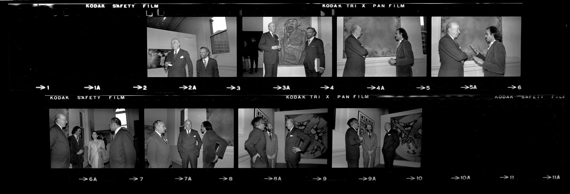Opening and reception for exhibition featuring contemporary paintings from India at Renwick Gallery, with Secretary S. Dillon Ripley, Joshua C. Taylor, director of National Collection of Fine Arts (NCFA), Lakshmi Kant Jha, India's ambassador to the United States, and artists Francis Newton Souza, Natvar Bhavsar, and Mohan Samant.