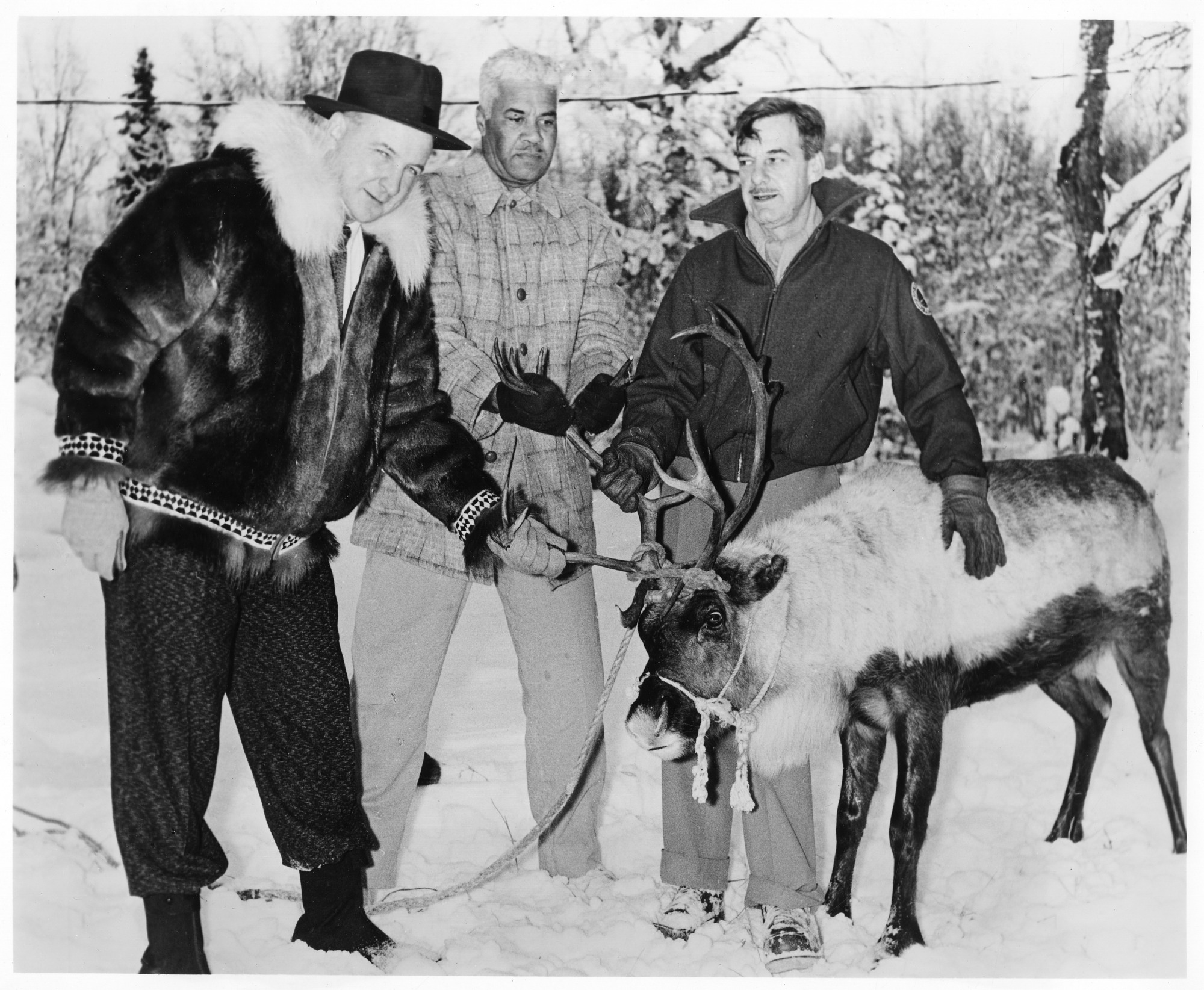 Motor carrier executives and animal experts here prepare for the second part of Operation Reindeer. George M. Sullivan (left), Traffic Manager for Garrison Fast Freight Division of Consolidated Freightways, Inc., together with Smithsonian National Zoological Park Senior Keeper Charles Thomas and Associate Director J. Lear Grimmer, expedite the reindeer to the train for Seward and a ship journey to Seattle. Grimmer and Thomas traveled to remote Kotzebue, Alaska on the Arctic Circle, where they rounded up the animals. An Alaska Air Command plane brought them to Anchorage. Alaska Steamship's S.S. Iliamna then took them 1,400 miles to Seattle, where a special 40 foot trailer from Consolidated Freightways drove the group 3, 100 miles to Washington, D.C. Operation Reindeer was the name for the transfer of 14 reindeer and 1 caribou to the National Zoological Park from Alaska in 1958. The animals were a gift for Alaska's admittance to the United States of American (which became official in 1959). The Operation was a joint effort between the Smithsonian, State of Alaska, Bureau of Indian Affairs, Consolidated Freightways, Alaska Air Command, Alaska Steamship Co., Alaska Railroad, and Garrison Fast Freight. The reindeer and caribou all arrived safely to Washington, D.C. on December 11, 1958, just in time to participate in that year's "Pageant of Peace" on the National Mall.