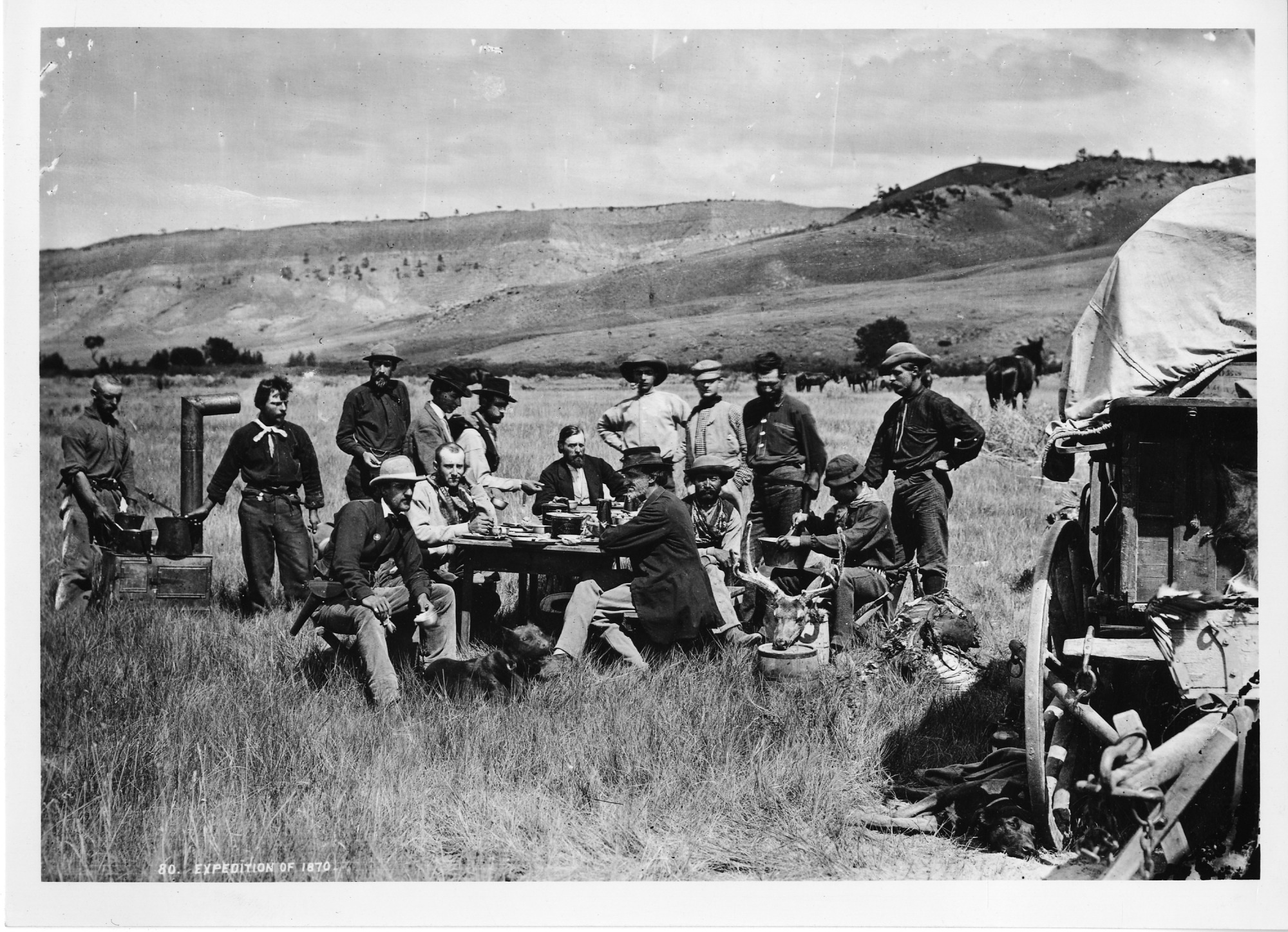 Members of the 1870 U.S. government survey of the Yellowstone River and Rocky Mountains led by Ferdinand Hayden (also known as the "Hayden Geological Survey"). Standing left to right: John "Potato John" Raymond and "Val," cooks; Sanford Robinson Gifford (1823-1880), landscape painter; Henry Wood Elliott (1846-1930), artist; James Stevenson (1840-1888), assistant; Henry D. Schmidt, naturalist; E. Campbell Carrington, zoologist; L. A. Bartlett, general assistant; William Henry Jackson (1843-1942), photographer. Sitting left to right: C. S. Turnbull, secretary; J. H. Beaman, meteorologist; Ferdinand Vandeveer Hayden (1829-1887), geologist in charge; Cyrus Thomas (1825-1910), agriculturist; Raphael, hunter; A. L. Ford, mineralogist. The Library of Congress copy of this photograph is captioned "A noon meal in Ferdinand V. Hayden's camp of the U.S. Geological and Geophysical Survey, Red Buttes, Wyoming Territory, August 24, 1870."