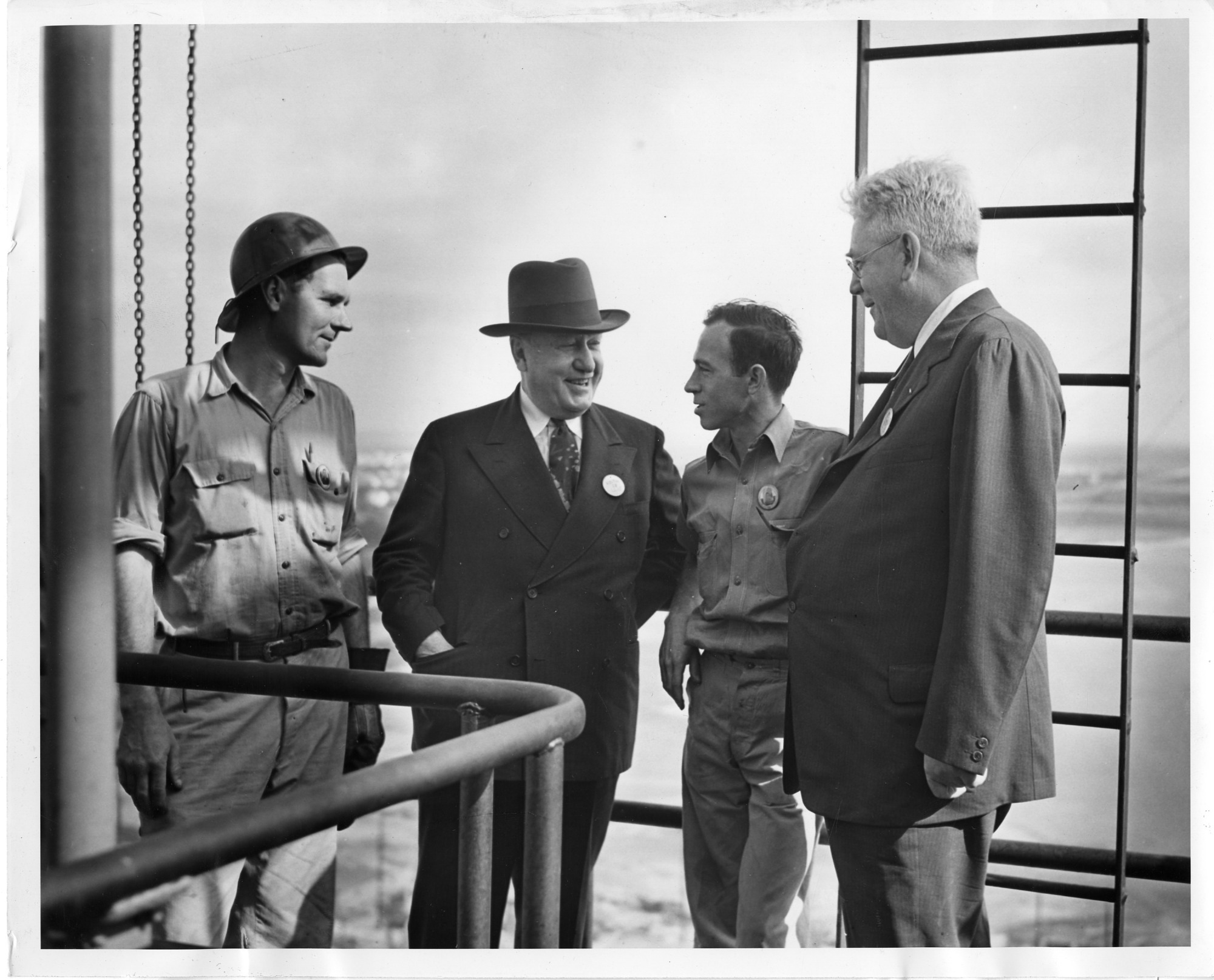 left to right: Texas City styrene plant distillation tower operator James Russell Dodds; William Martin Jeffers (1876-1953), U.S. Rubber Director at the War Production Board; Texas City styrene plant supervisor Merril Tyson; and Colonel Bradley Dewey (1887-1974), Deputy U.S. Rubber Director. Jeffers was president of Union Pacific Railroad, 1937-1946, and coordinated U.S. production of rubber during World War II. The War Production Board officials were inspecting the Monsanto Chemical Company plant in Texas City, Texas.