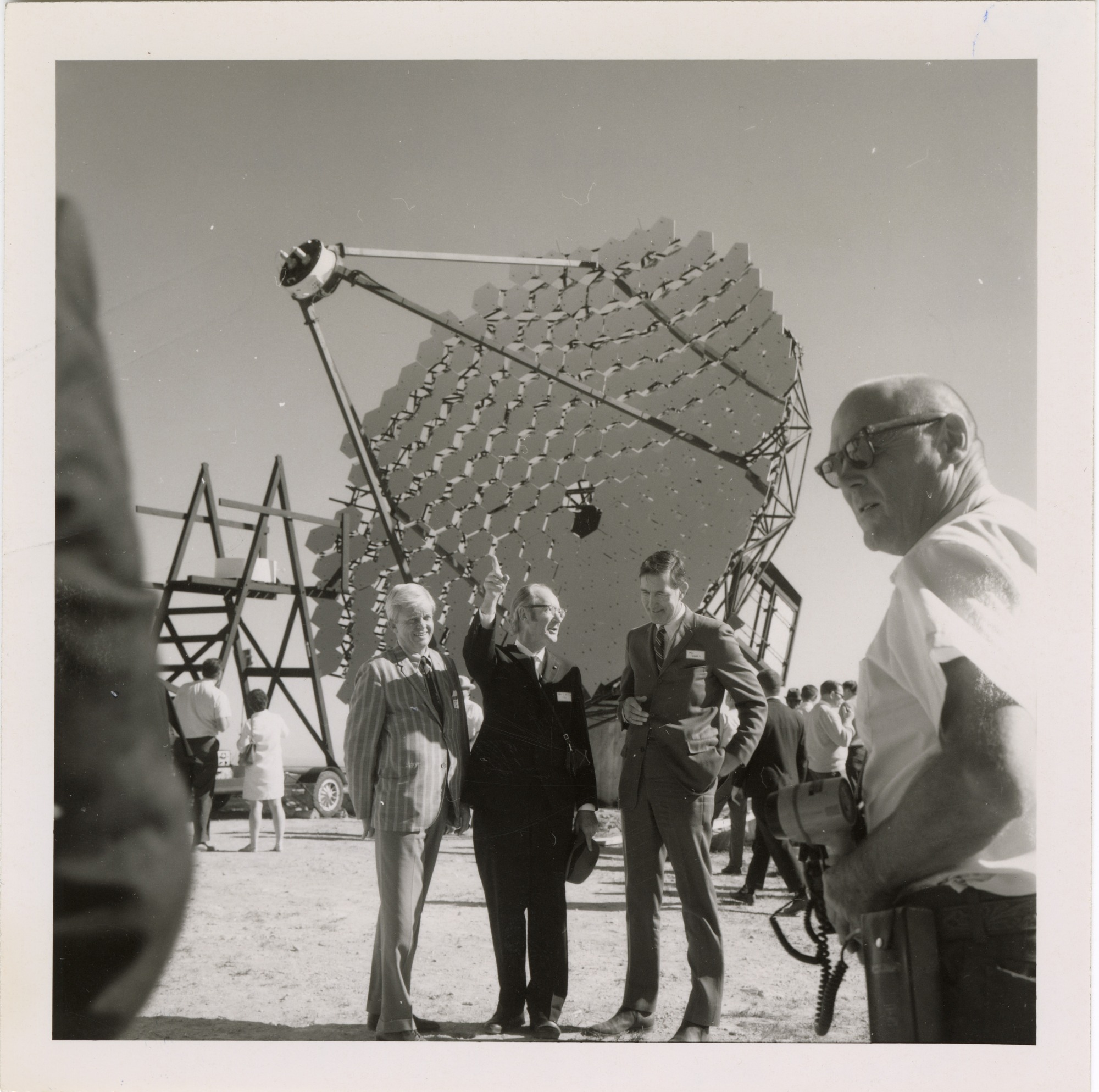 (Left to right) Tucson mayor Jim Corbett, Smithsonian Astrophysical Observatory Director Dr. Fred Whipple (1955-1973), and Rep. Morris K. Udall (D-AZ) stand in front of a 34-foot gamma-ray collector at the Smithsonian Astrophysical Observatory, Mt. Hopkins, Arizona. The large surface light collector, really a mosaic of 252 polished glass mirrors, searches for sources of gamma-ray radiation in the heavens, a feat never attempted before from a ground-based observatory.