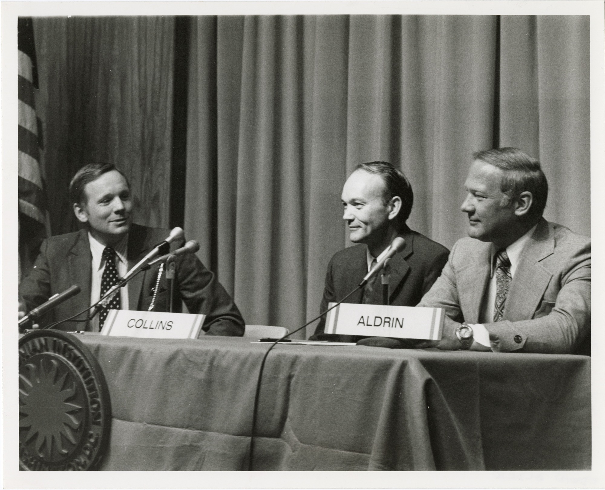 Apollo 11 astronauts Neil Armstrong, Michael Collins, and Edwin "Buzz" Aldrin at a press conference in the Carmichael Auditorium of the National Museum of History and Technology, now known as the National Museum of American History, marking the fifth anniversary observance of the Apollo 11 mission.
