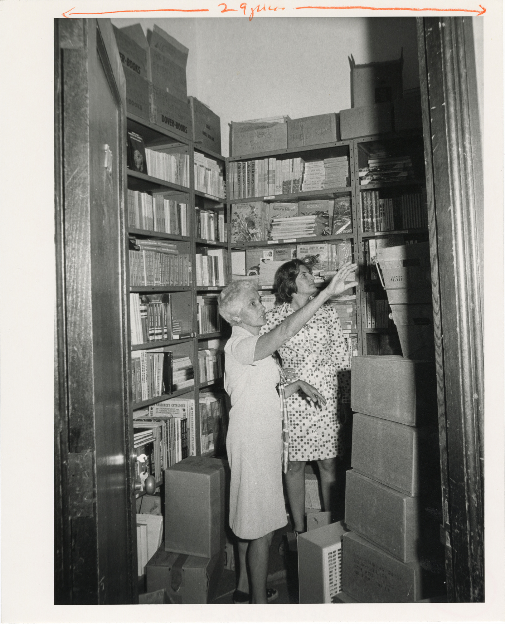 Florence Lloyd and Barbara Brand in the book stockroom at National Museum of Natural History, where Museum Shops offices are located.