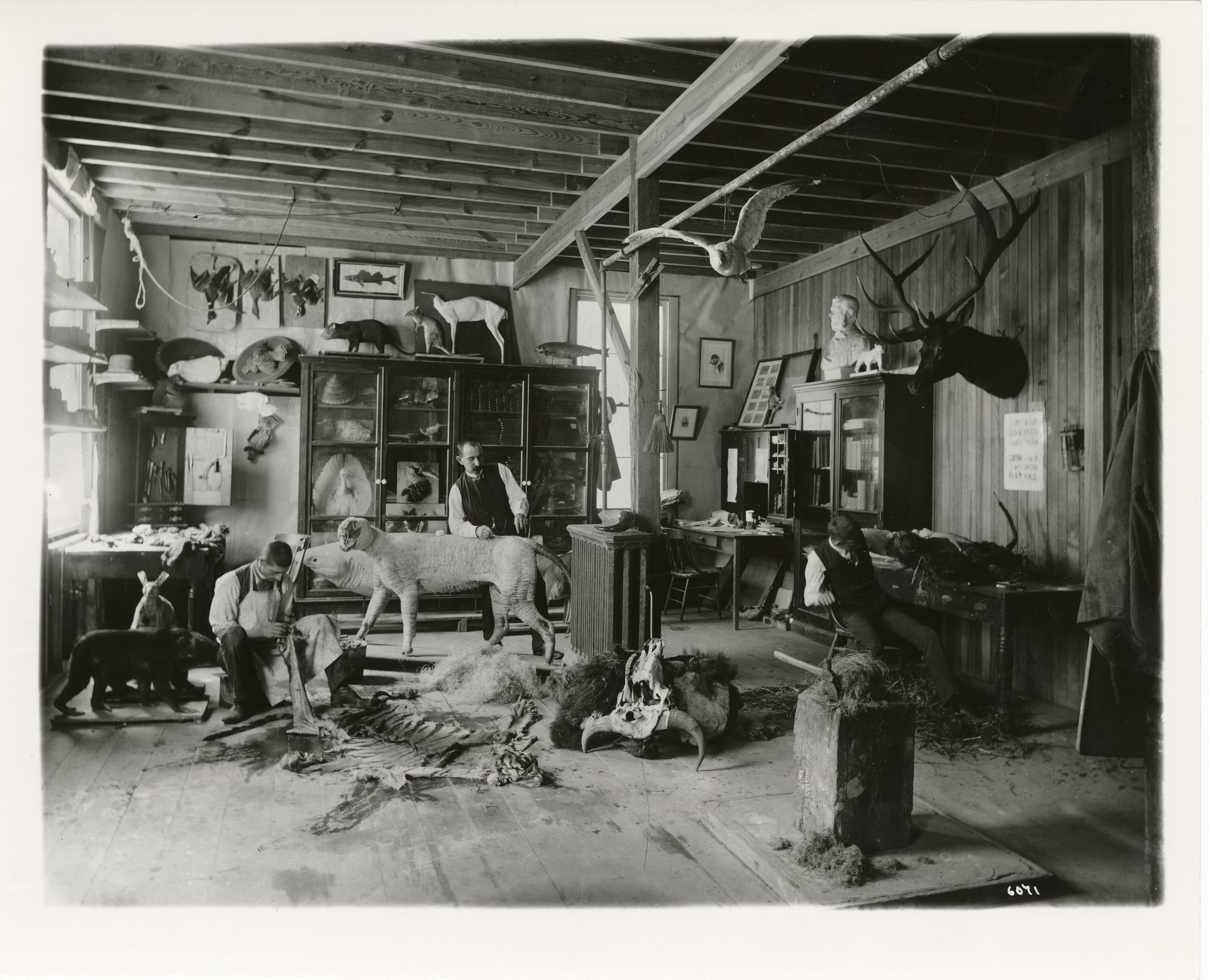 Taxidermists at work in the model and taxidermy shop in the lower level of the temporary shed in the South Yard behind the Smithsonian Institution Building, or Castle, with William Temple Hornaday (center) and Andrew Forney (left).