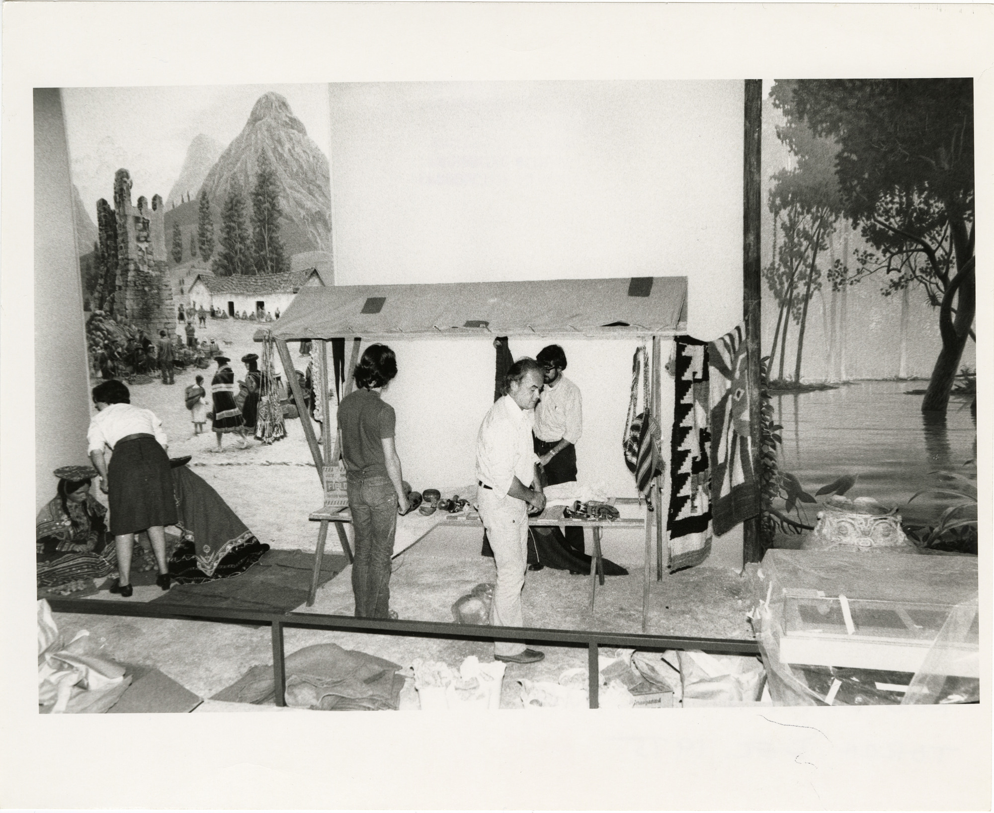 In Hall 23 of National Museum of Natural History, with Susan Wallace, model maker in the Office of Exhibits Central; Dr. Geoffrey Conrad, archeologist and exhibition script writer; Tom Thill, artist on the Graphic Production staff; and Steven Makovenyi, designer in the Design Division of the Office of Exhibits.