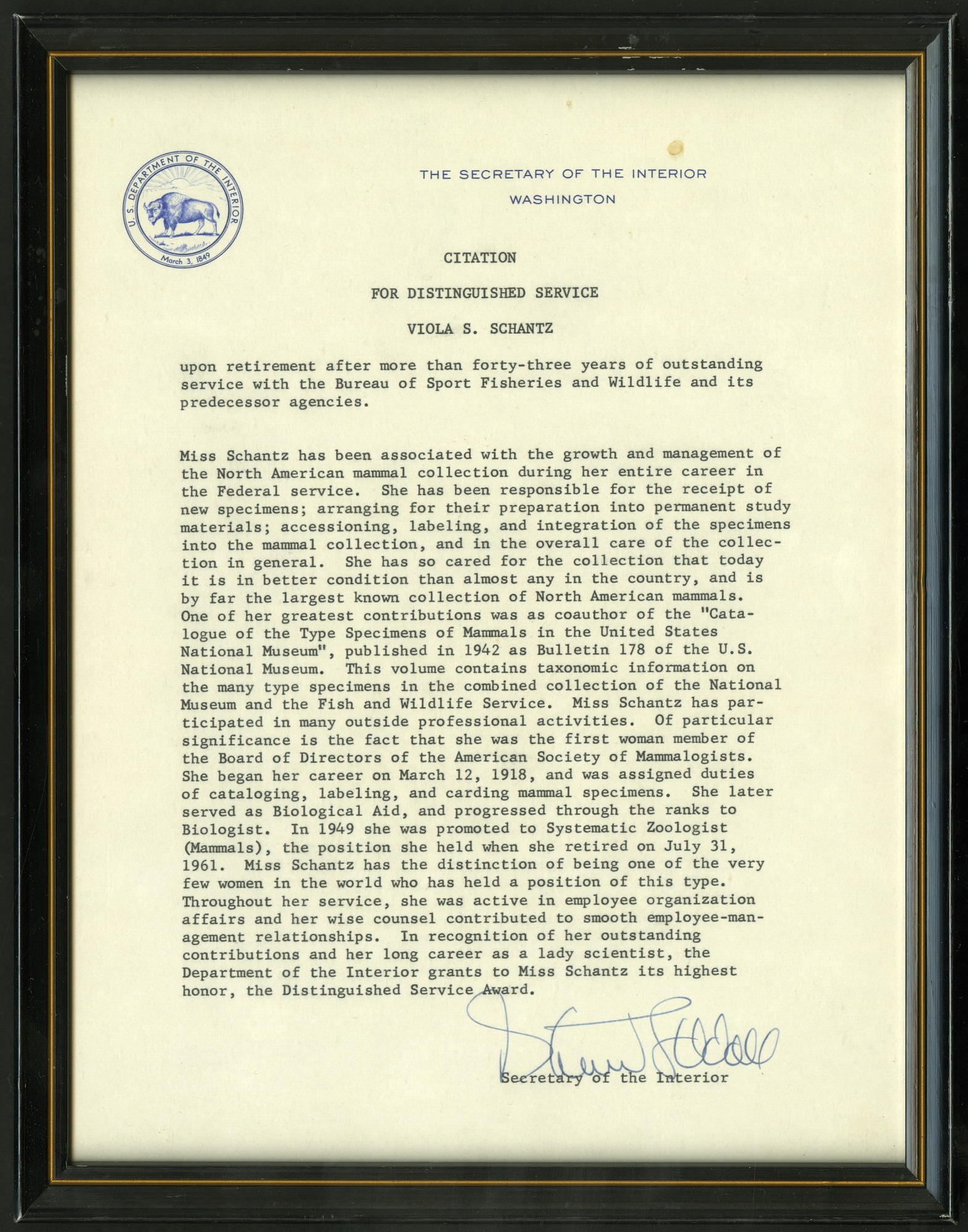 United States Department of the Interior citation for distinguished service presented to Viola Schantz upon her retirement after more than 43 years of service with the Bureau of Sport Fisheries and Wildlife. Received on January 18, 1962.