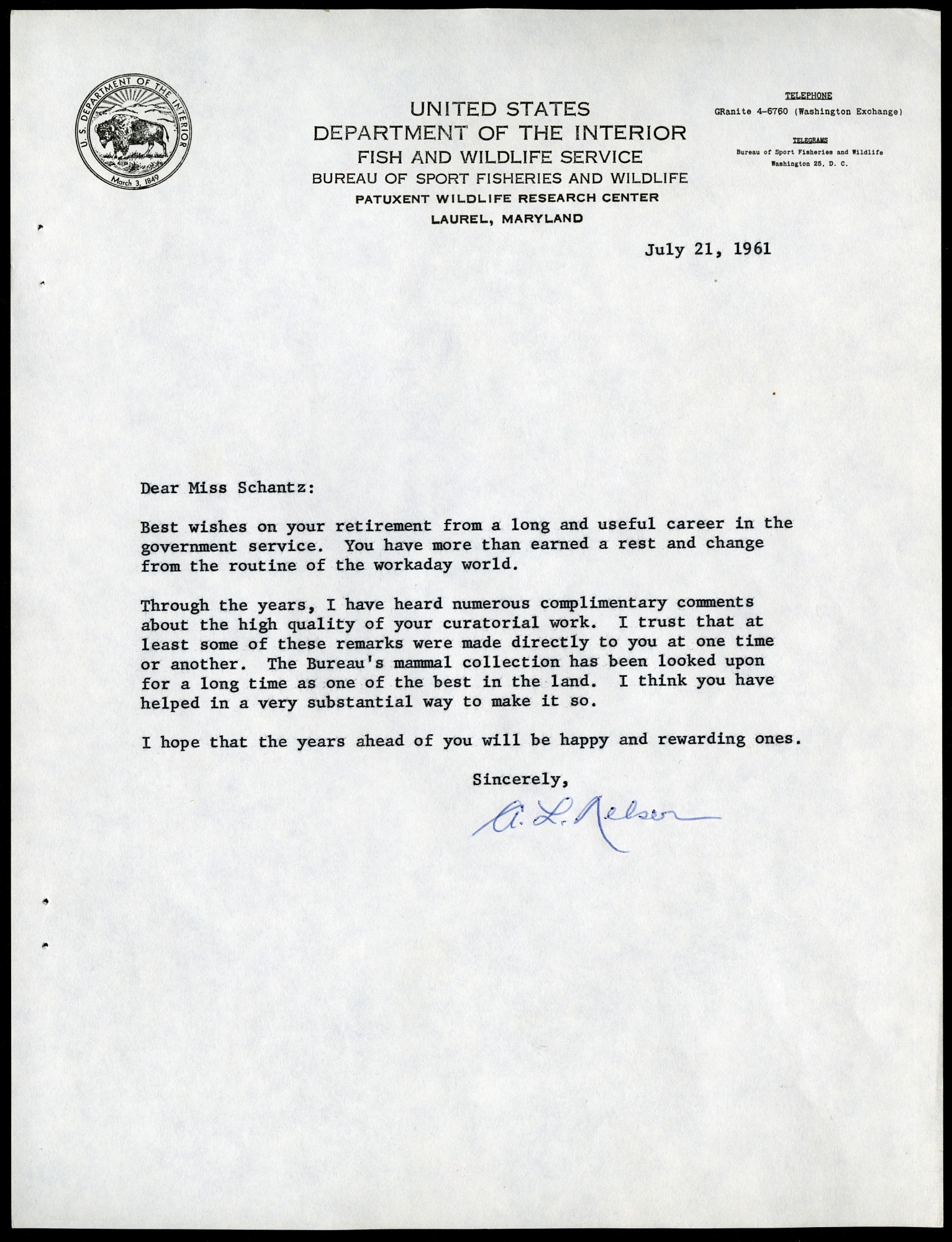 Letter of congratulations from A. L. Nelsen to Viola Schantz upon her retirement.