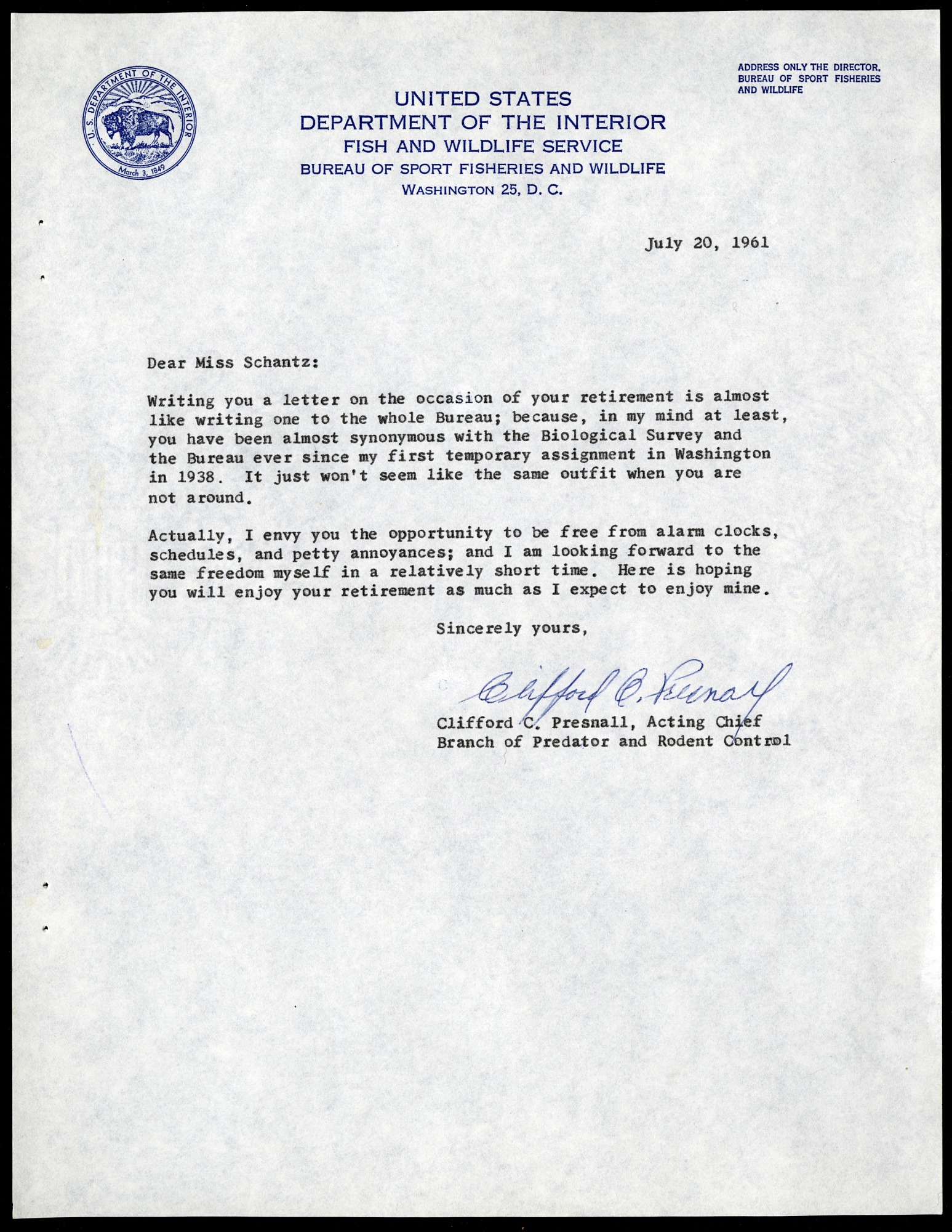 Letter of congratulations from Clifford C. Presnall, Acting Chief, Branch of Predator and Rodent Control, to Viola S. Schantz upon her retirement. Viola Shelly Schantz (1895-1977) served as a Biological Aide, Biologist and Systematic Zoologist for the United States Fish and Wildlife Service from 1918 to 1961. Stationed at the Smithsonian throughout her career, she also served as the curator for the North American mammal collection in the National Museum of Natural History.