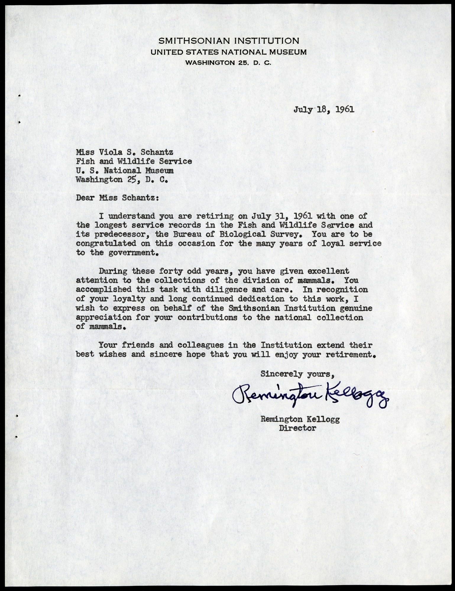 Letter of congratulations from Remington Kellogg, United States National Museum Director, to Viola S. Schantz upon her retirement. Viola Shelly Schantz (1895-1977) served as a Biological Aide, Biologist and Systematic Zoologist for the United States Fish and Wildlife Service from 1918 to 1961. Stationed at the Smithsonian throughout her career, she also served as the curator for the North American mammal collection in the National Museum of Natural History.