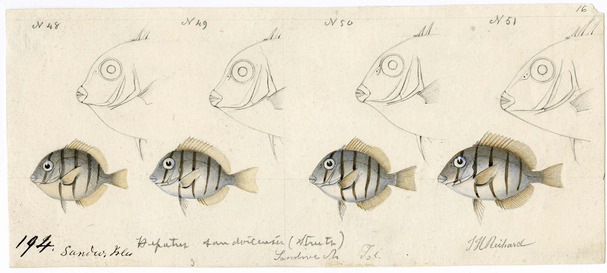 Four fish drawn by John Richard, observed or collected from the Hawaiian Islands during the United States Exploring Expedition, 1838-1842.