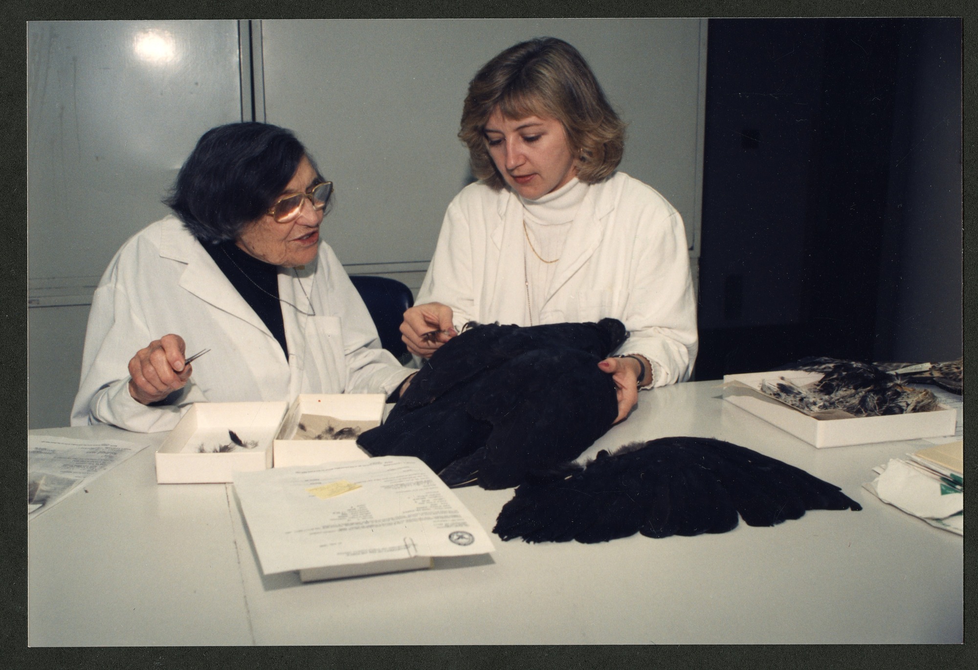Roxie Laybourne (left) and Carla Dove (right) behind a counter in the Bird Division. Carla Dove is holding a study skin of a black vulture in one hand and a feather in the other. Roxie Laybourne holds forceps in her right hand.