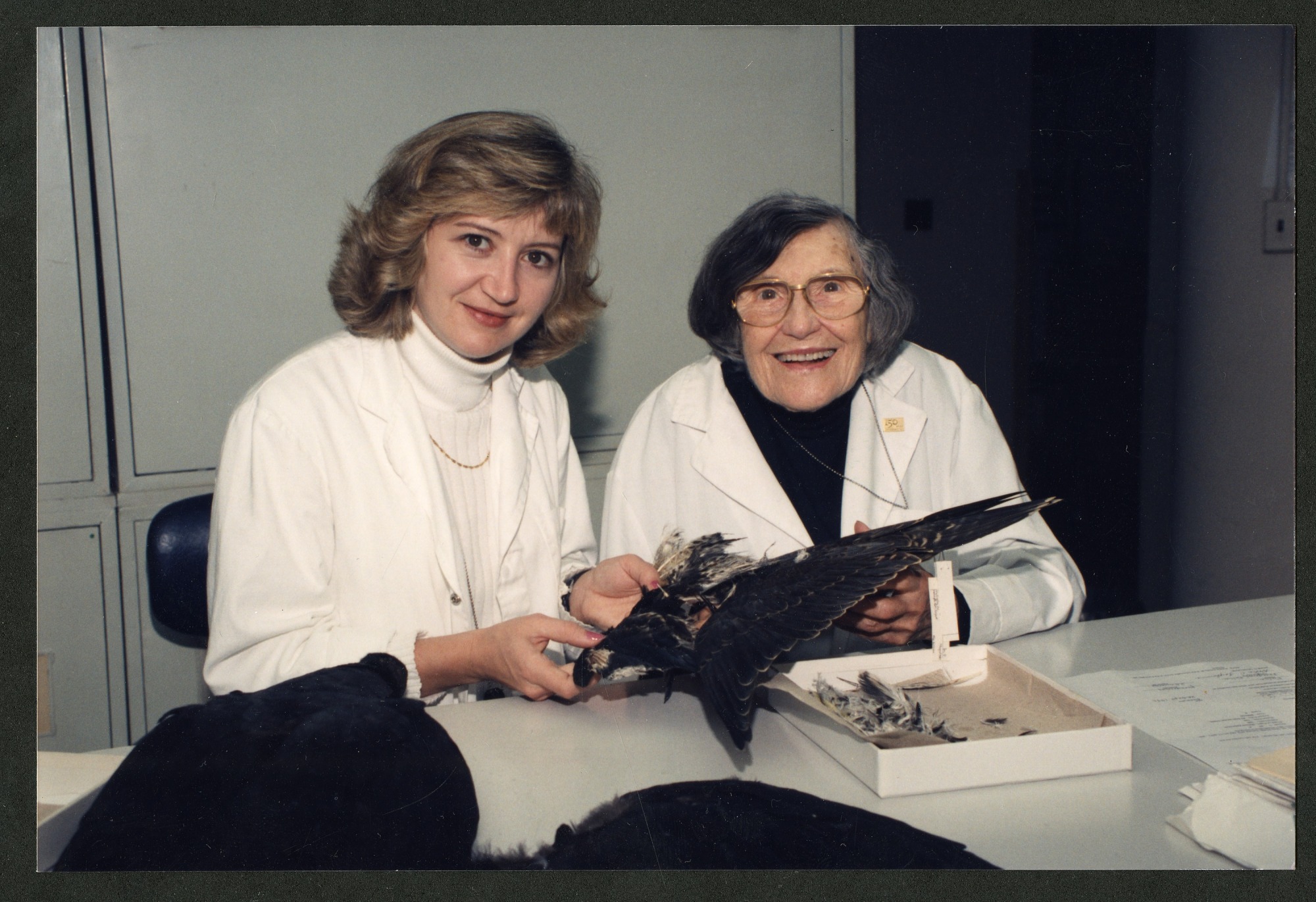 Carla Dove (left) and Roxie Laybourne (right) behind a counter in the Bird Division holding remains of a bird, and a skin with one wing outstretched. On the counter in front of them are a black vulture skin and boxes of feathers and bird remains.