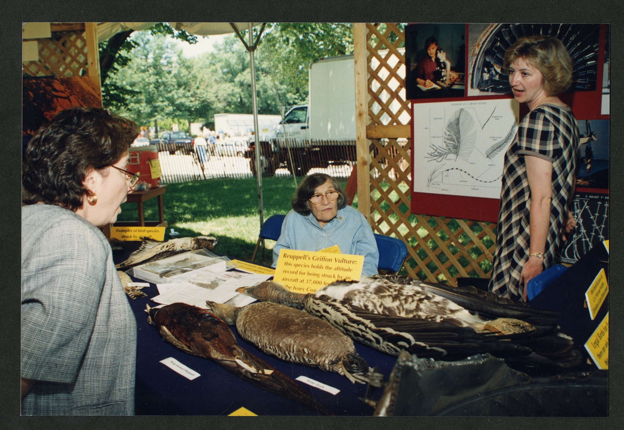 Roxie Laybourne sits and Carla Dove stands behind a table outside. Carla Dove points to a photo of barbules from a scanning electron microscope. On the table in front of them there is a Reuppell's Griffon Vulture with a sign indicating the altitude record for a bird strike.