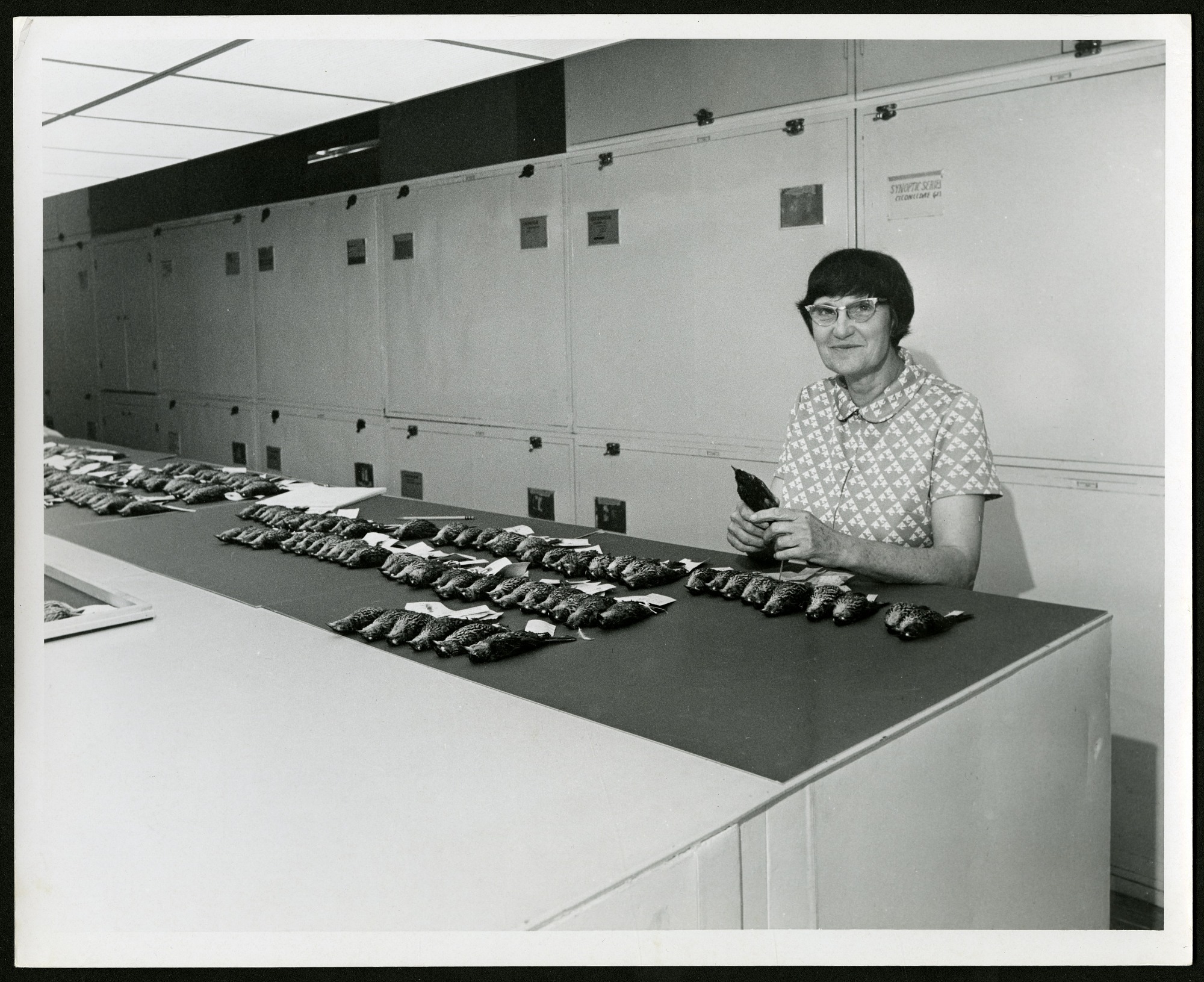 Roxie Laybourne stands behind the counter in the Birds Division with dozens of a single species of songbird laid out in rows.