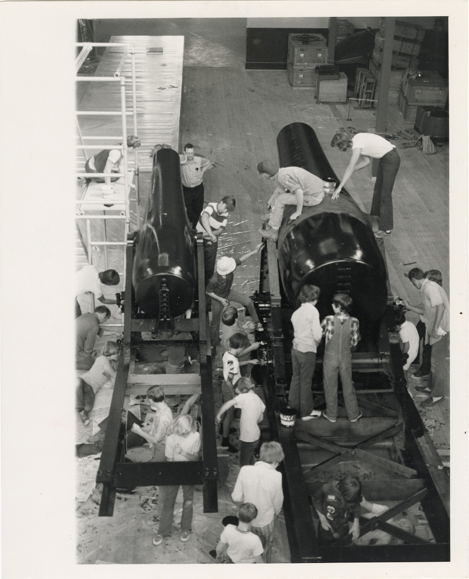 Boy Scouts from Troop 773, Potomac, Maryland, paint Civil War coast defense guns for the "1876: A Centennial Exhibition" in the Arts and Industries Building.