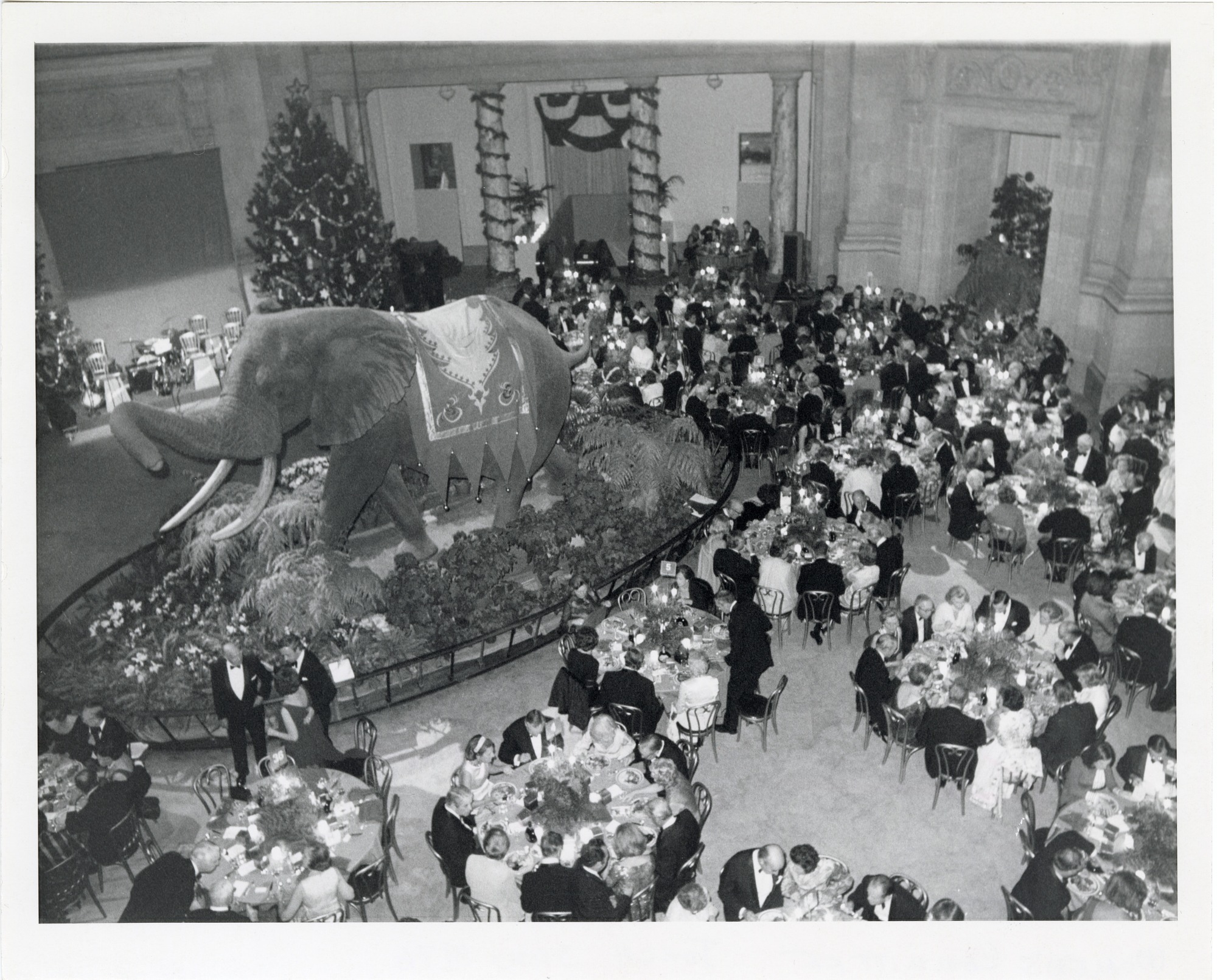 Smithsonian Women's Committee Fifth Annual Christmas dinner-dance in the rotunda of the National Museum of Natural History, with Fenykovi elephant in view.
