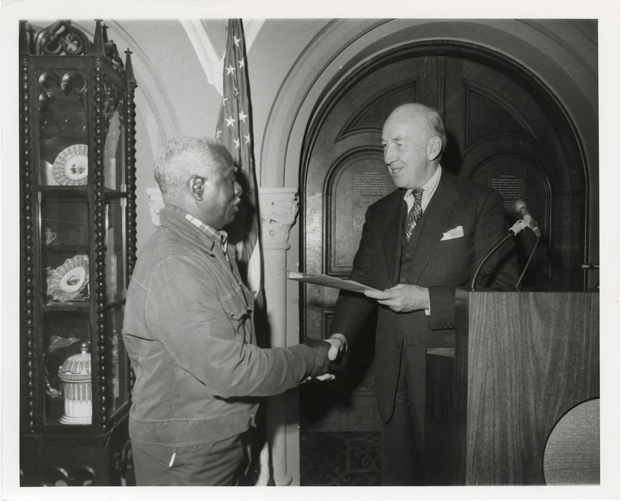 Secretary S. Dillon Ripley congratulates William H. Green of the National Air and Space Museum for 35 years of federal service at award ceremony in Lounge of the Smithsonian Institution Building, or Castle.