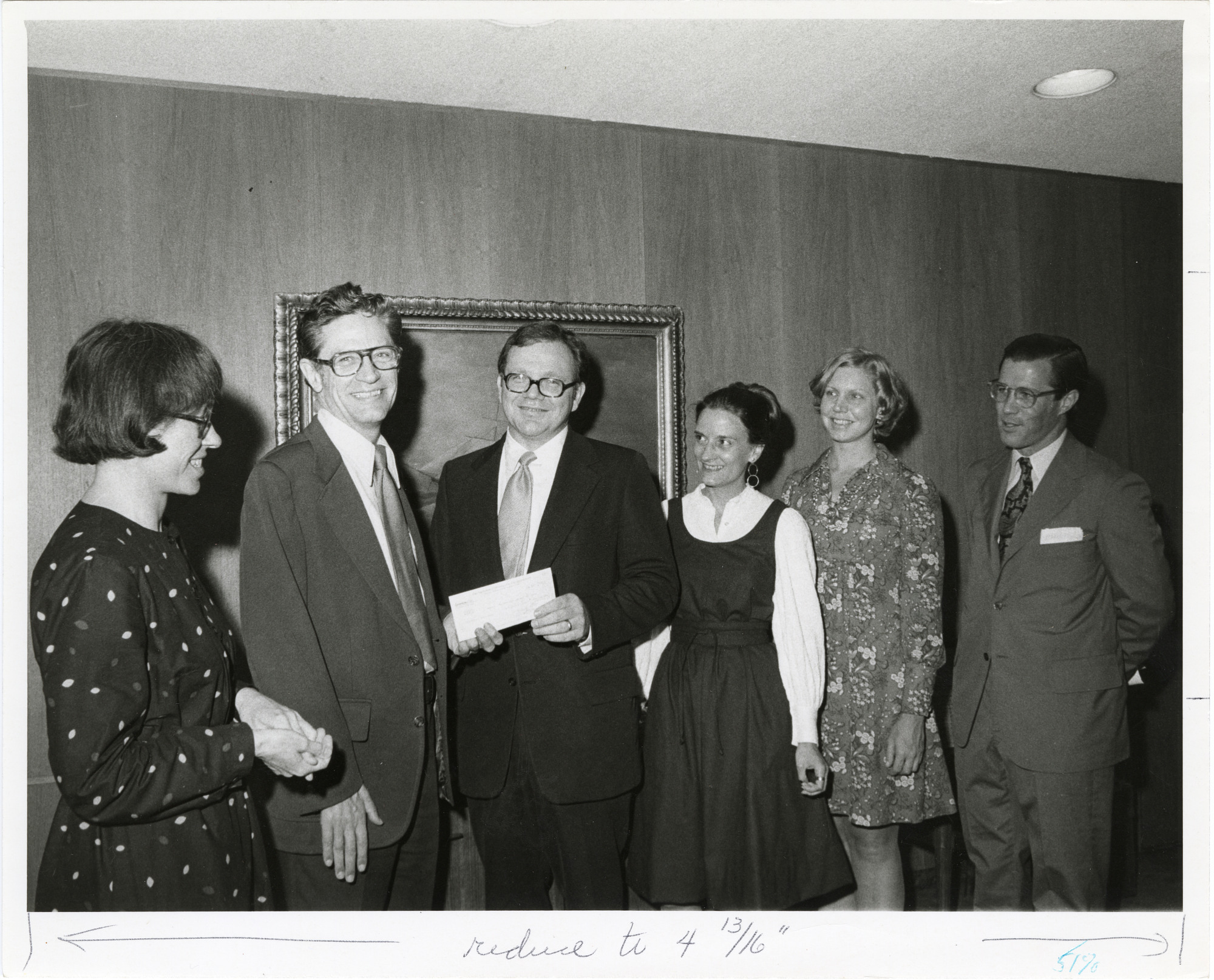 Presentation of check to NMHT director Brooke Hindle in his office at National Museum of History and Technology, now known as National Museum of American History, from Certain-teed Corporation. Caption from Torch: "The Certain-teed Corporation of Valley Forge, Pa., a leading building materials manufacturer, will sponsor the installation of an authentic 19th-century balloon-frame structure adjacent to the Ipswich House at the Museum of History and Technology to complete the redesigned 'Hall of Everyday Life in America.' Pictured above receiving the grant from Certain-teed are (I. to r.) Rodris Roth, curator, Department of Cultural History; Brooke Hindle, director, MHT; Edwin Harper, vice president, Certain-teed Corp.; Anne Golovin, associate curator, Department of Cultural History; Dorothy Wackerman, director of public affairs, Certain-teed Corp.; James Lyons, deputy director, Office of Membership and Development. "
