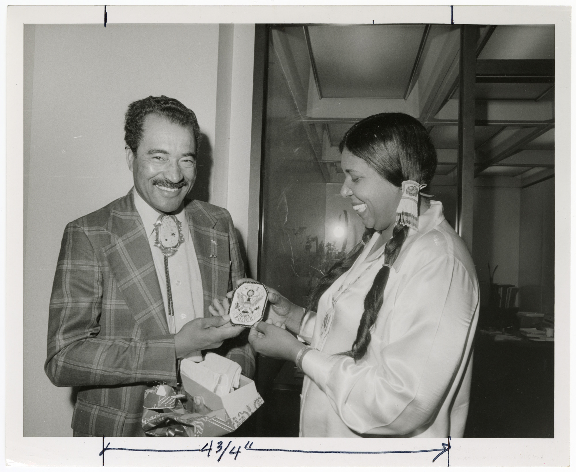 Caption from Torch: "Lucille Dawson, coordinator of the Native American Area at the Festival of American Folklife, presented a beaded reproduction of the U.S. Park Police Badge to Officer J.E. Thomas, in appreciation for his tireless service during Festivals of this and previous years. Officer Thomas is unofficially credited with rescuing more lost children at folklife festivals than anyone else in the history of the event. His beaded badge was made in Oklahoma by a Native American of the Kiowan tribe."