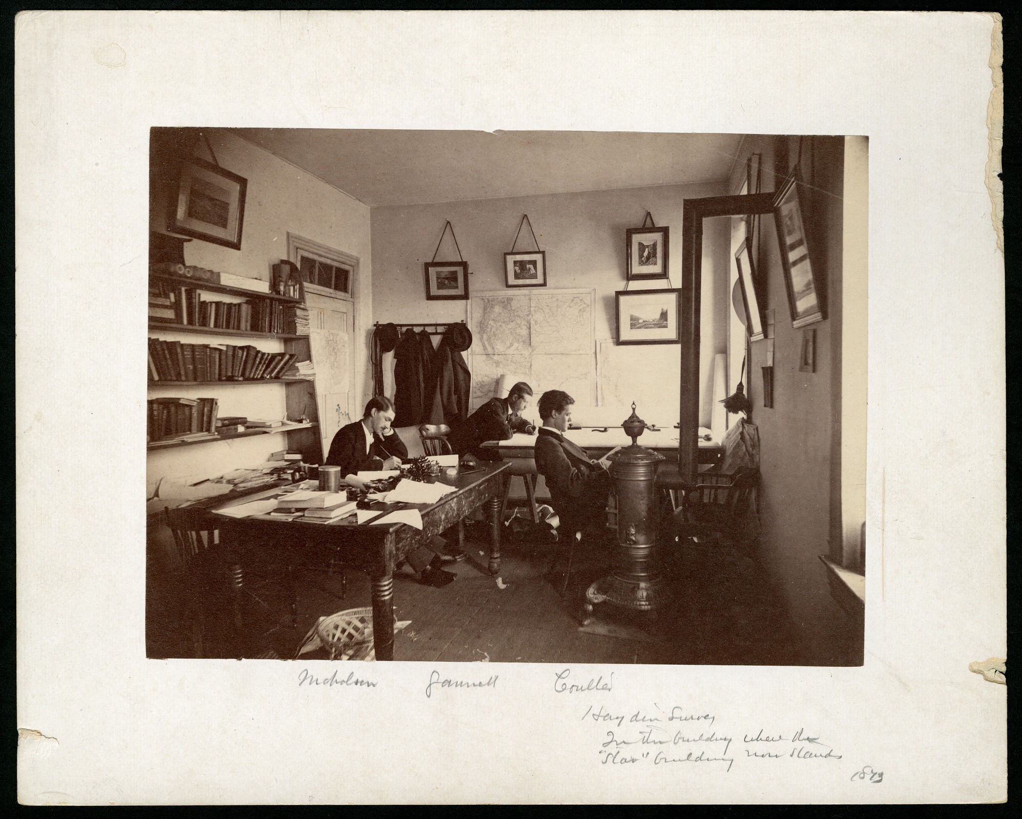This office space, most likely located at 1101 Pennsylvania Avenue, NW, in Washington, D.C., belonged to the Hayden Survey, an expedition that went throughout western Wyoming and Colorado that later led to the formation of the U.S. Geological Surveys of the Territories within the Department of the Interior. Pictured are William Nicholson, Henry Gannett, and John Merle Coulter working at desks in their office.