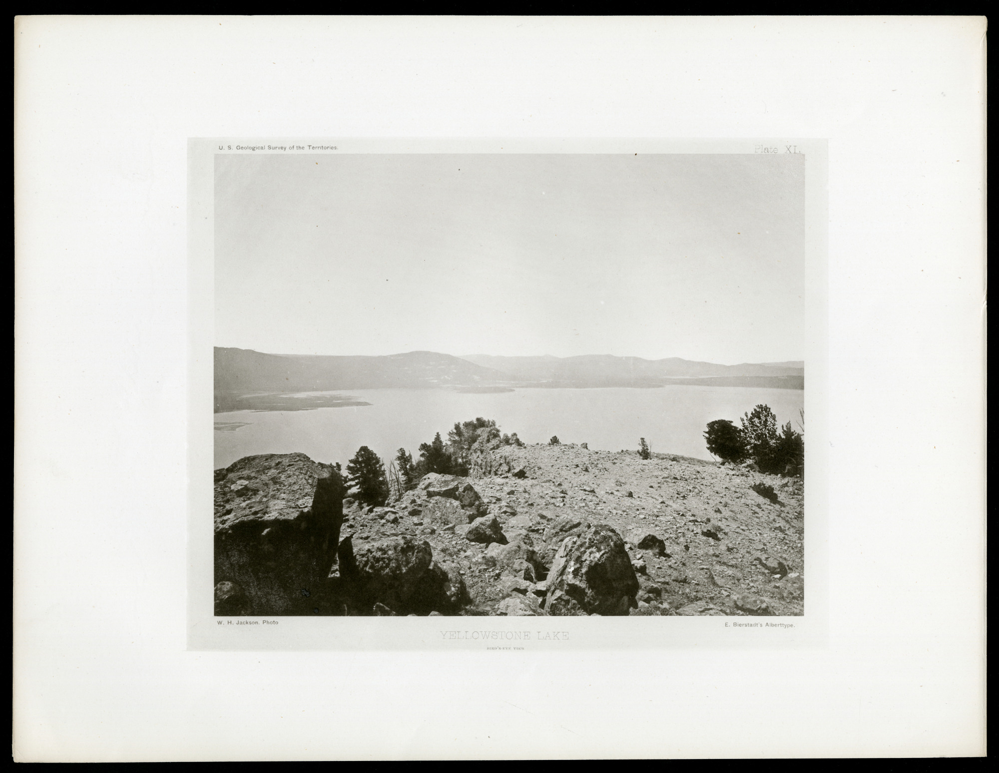 Pictured is a Bird's Eye View of Yellowstone Lake. This image was taken as part of the Department of the Interior's U.S. Geological Surveys of the Territories. William Henry Jackson, then a budding photographer, took thousands of photographs for the survey, most notably the first images of the headwaters of the Yellowstone River.