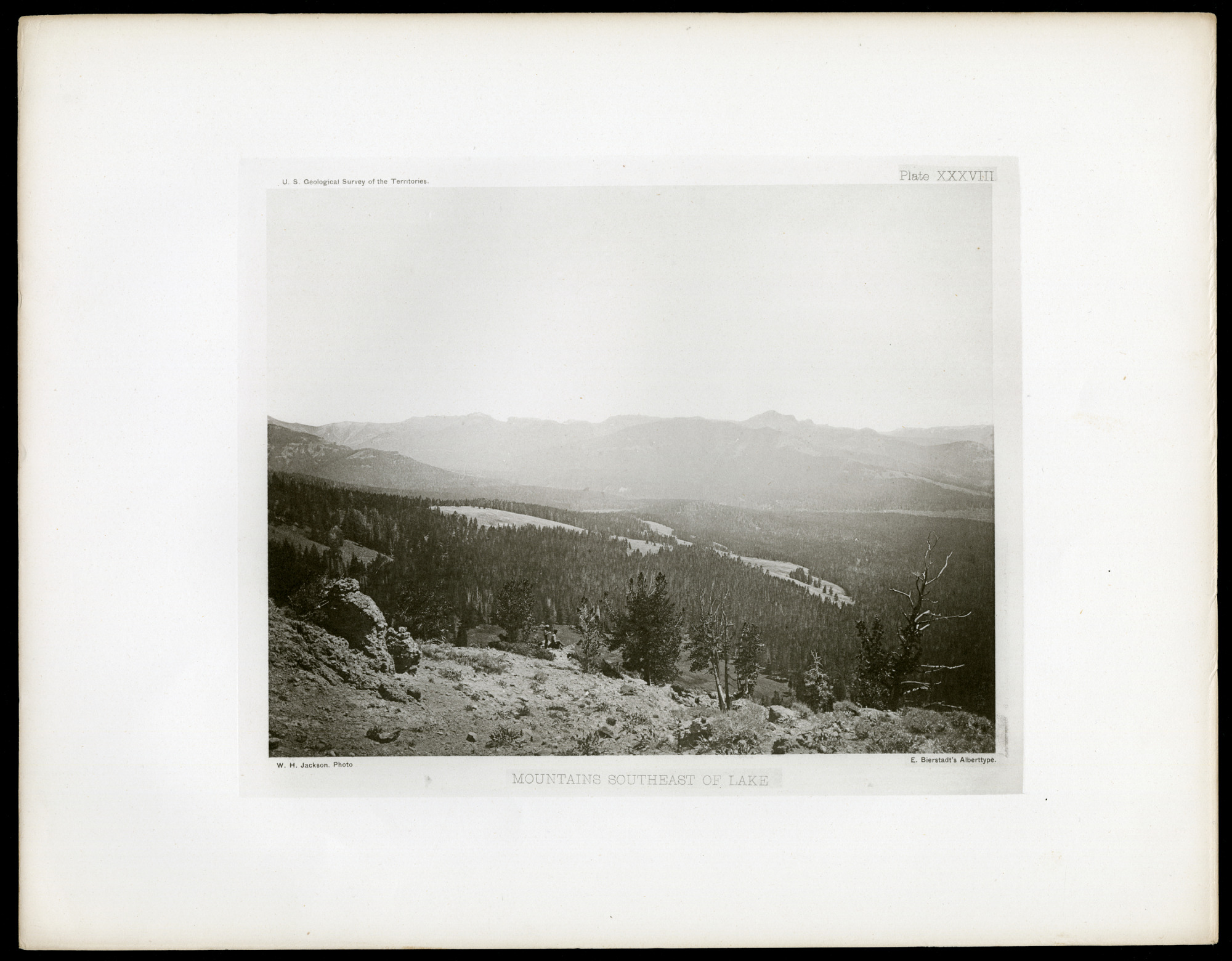 Pictured are Mountains Southeast of Yellowstone Lake. This image was taken as part of the Department of the Interior's U.S. Geological Surveys of the Territories. William Henry Jackson, then a budding photographer, took thousands of photographs for the survey, most notably the first images of the headwaters of the Yellowstone River.