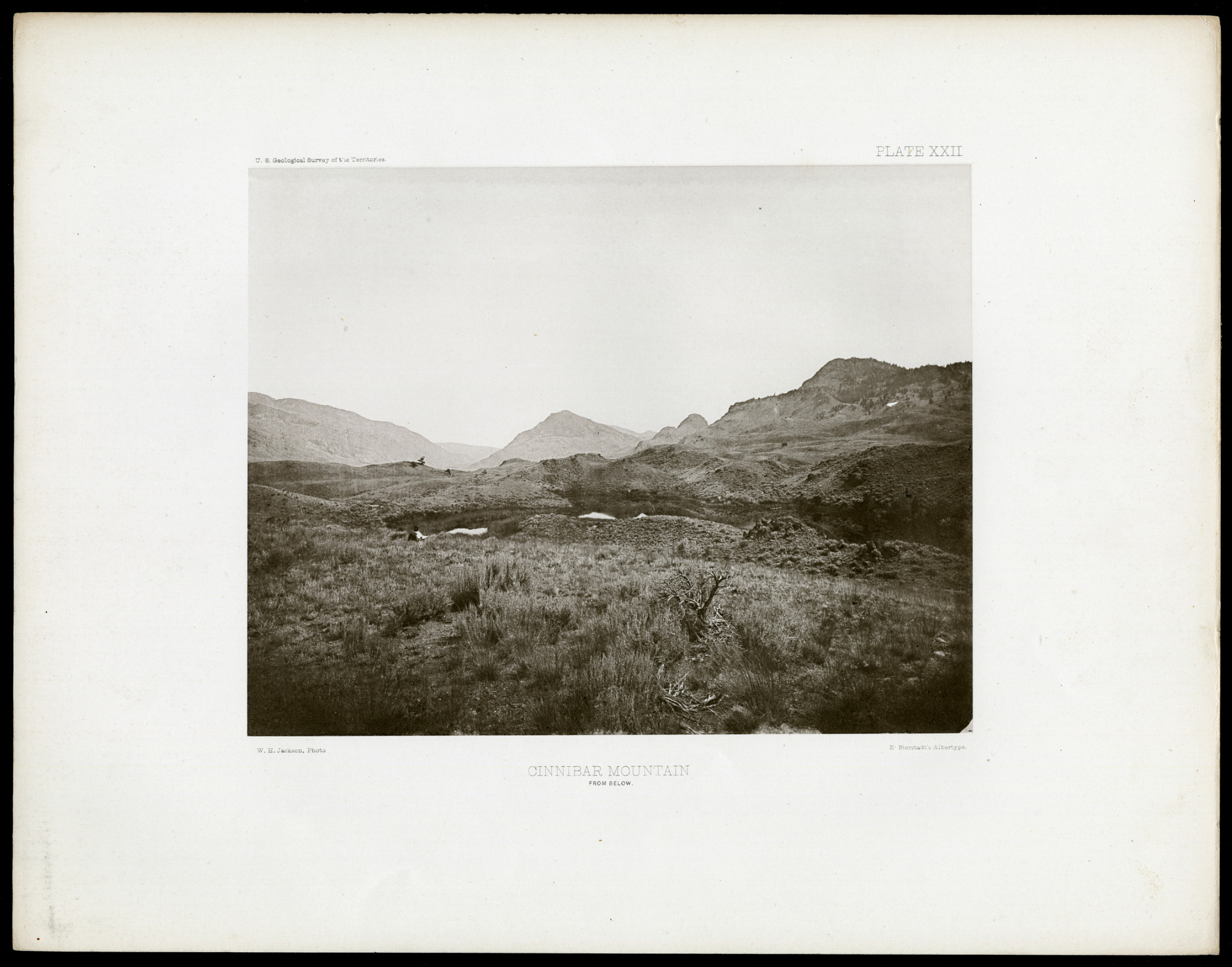 Pictured is Cinnabar Mountain from below. This image was taken as part of the Department of the Interior's U.S. Geological Surveys of the Territories. William Henry Jackson, then a budding photographer, took thousands of photographs for the survey, most notably the first images of the headwaters of the Yellowstone River.