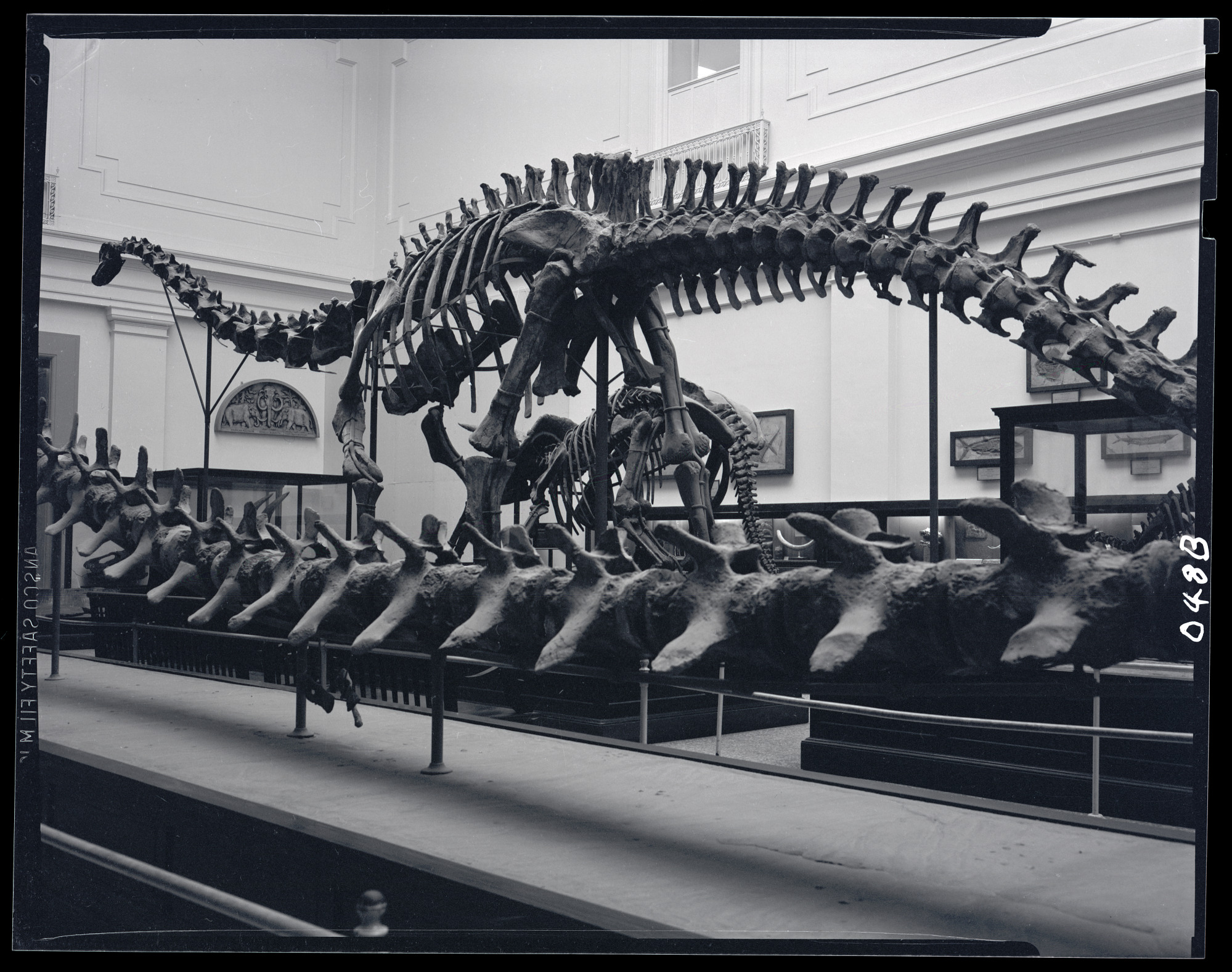 Diagonal view from rear of Diplodocus skeleton.