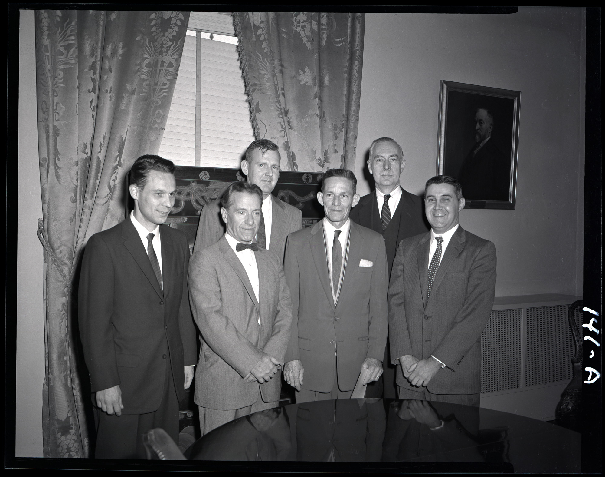 After completion of a six month training in the exhibits laboratory of the Museum of Natural History under the tutelage of Rolland O. Hower (left) and Watson Perrygo (second from left), N. Trinidad Pino Triana (third from left) of the Museo Provincial Ignacio Agramonte of Camaguey, Cuba, is awarded a certificate of achievement in the Regents' Room in the Smithsonian Institution Building, or Castle, by Secretary Leonard Carmichael (back right). Also pictured is Dr. Clifford Evans (back left), associate curator in the Division of Archeology, Department of Anthropology.