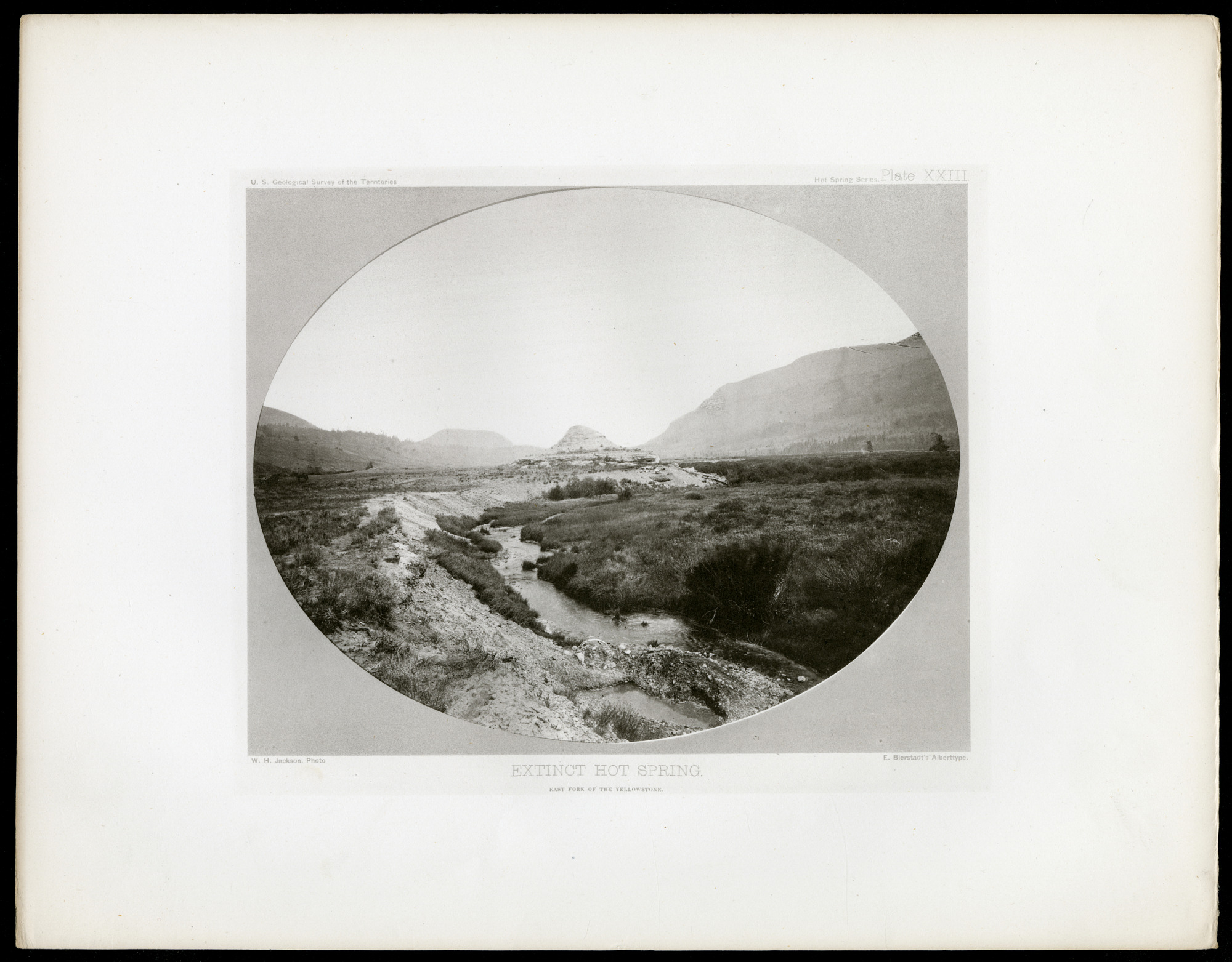 Pictured is an extinct hot spring. This image was taken as part of the Department of the Interior's U.S. Geological Surveys of the Territories. William Henry Jackson, then a budding photographer, took thousands of photographs for the survey, most notably the first images of the headwaters of the Yellowstone River.