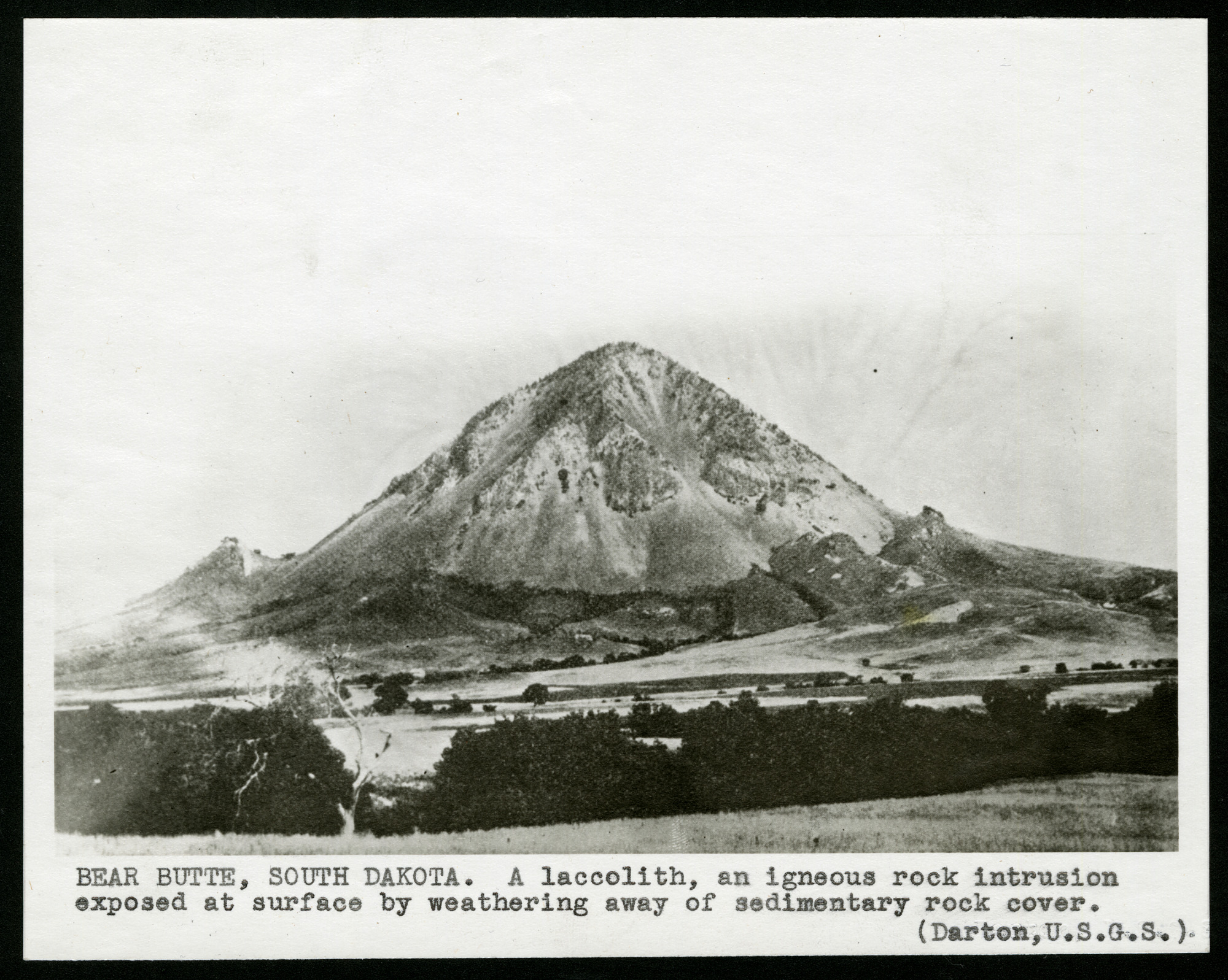 A laccolith, an igneous rock intrusion exposed at surface by weathering away of sedimentary rock cover.