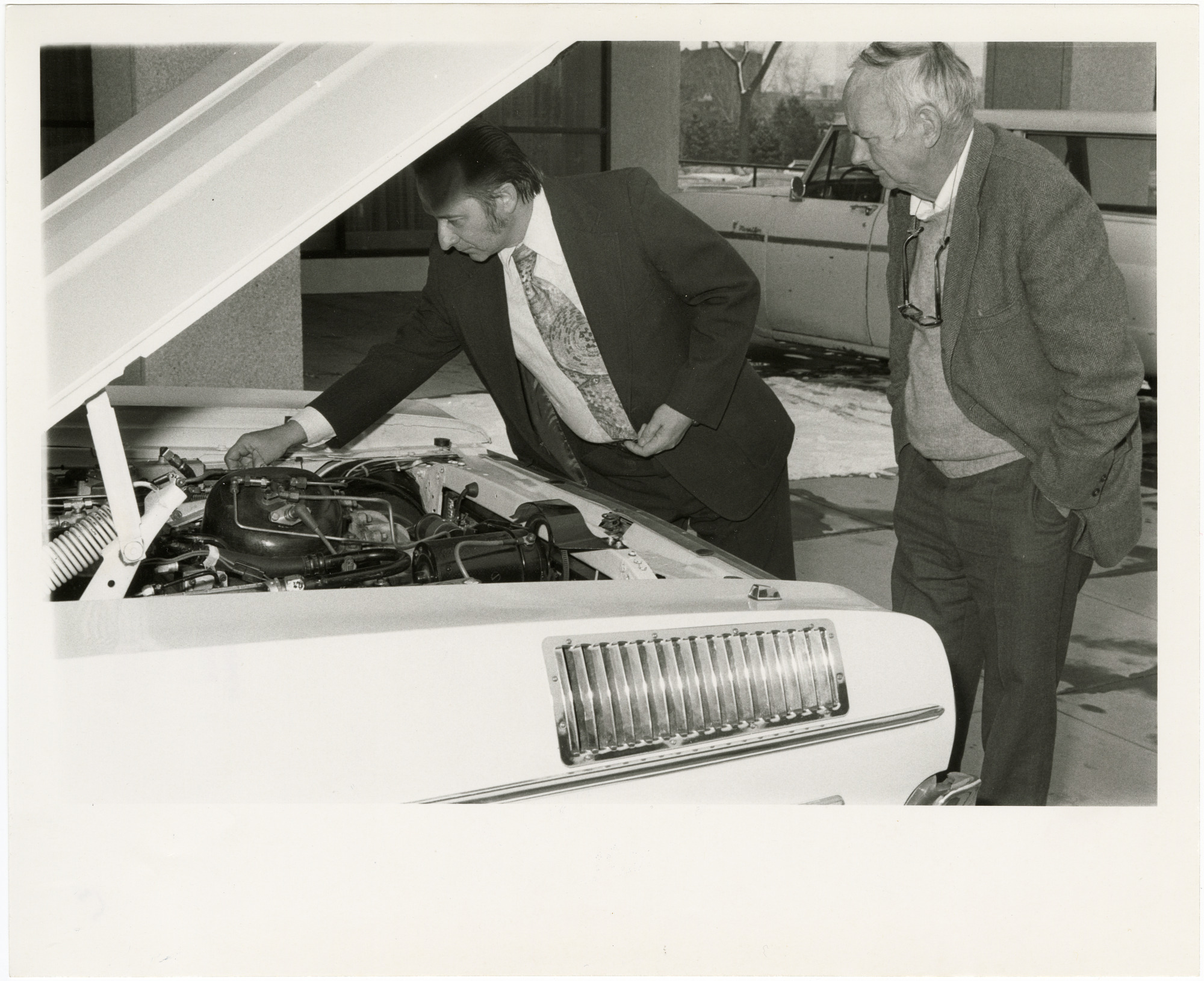 Caption from Torch: "Edwards Park (right), a member of the Board of Editors of Smithsonian magazine, and George Thur, turbo-engineer for the Energy Research and Development Administration, inspect the turbo-drive Plymouth, one of four ERDA 'cars of the future' which were driven in President Carter's Inaugural Parade. Use of the environment-sparing cars was suggested by the Smithsonian, which for many years has been concerned with the scientific aspects of energy and the environment."