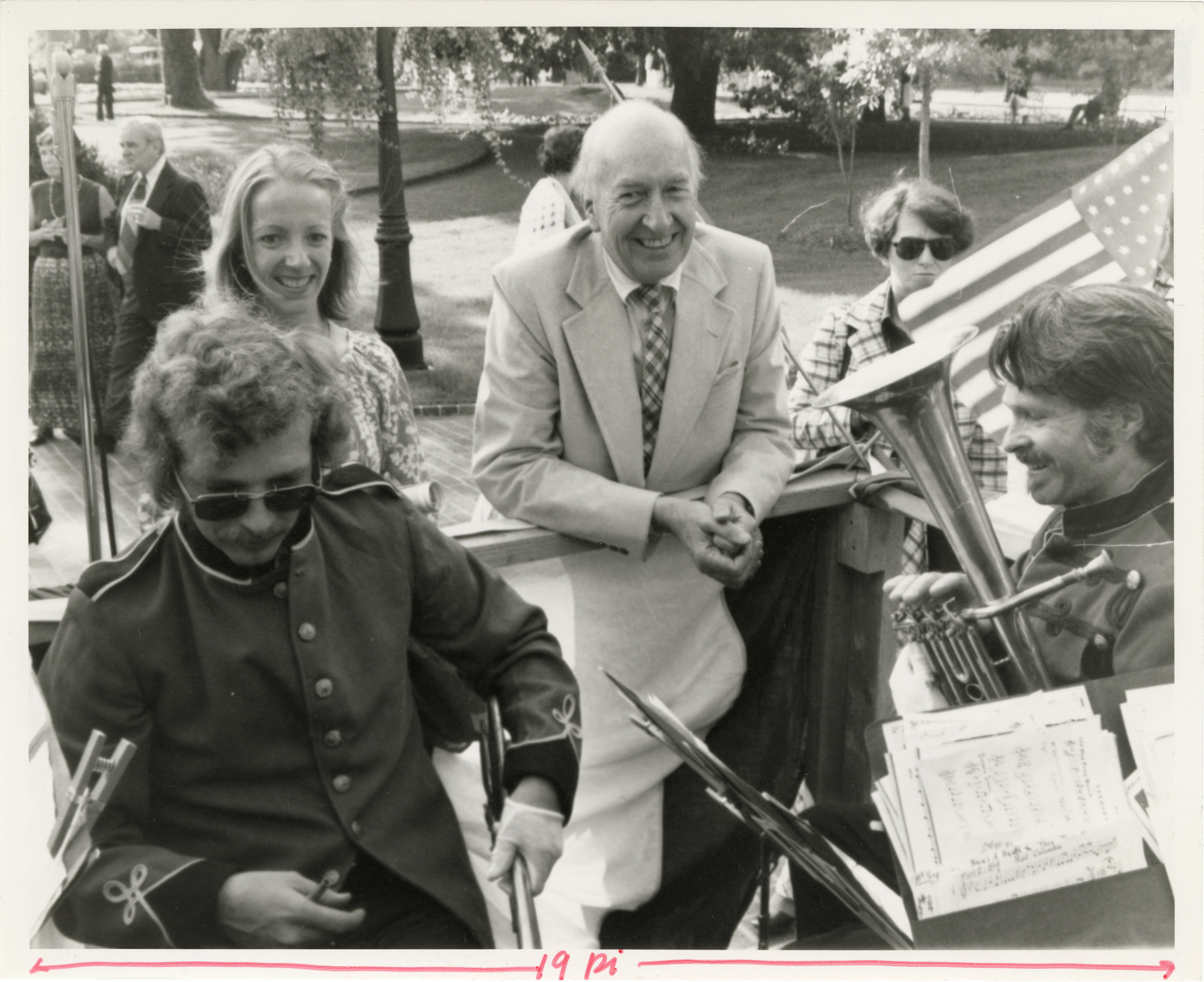 Caption from Torch: "Mr. Ripley visits with Robert Sheldon of the Smithsonian's Division of Musical Instruments (left), and members of the Lilly Belle Saxhorn Brass Band during a break in the music. The occasion was "A Victorian Evening at the Smithsonian," sponsored by the Contributing Membership Program of the Smithsonian Associates."