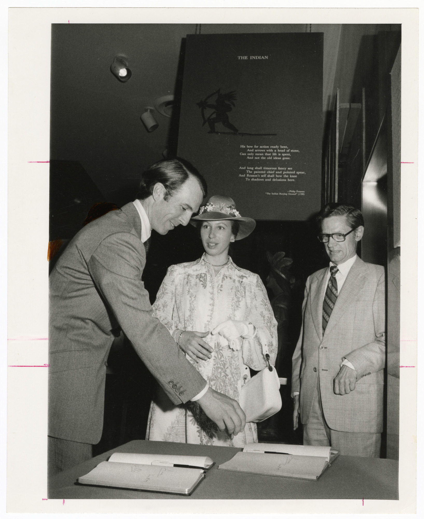 Her Royal Highness Princess Anne and husband Captain Mark Phillips of Great Britain visit the "Silver Jubilee" exhibition commemorating the twenty-fifth anniversary of the reign of Great Britain's Queen Elizabeth II at the National Museum of History and Technology (NMHT), now known as the National Museum of American History, with NMHT director Brooke Hindle.
