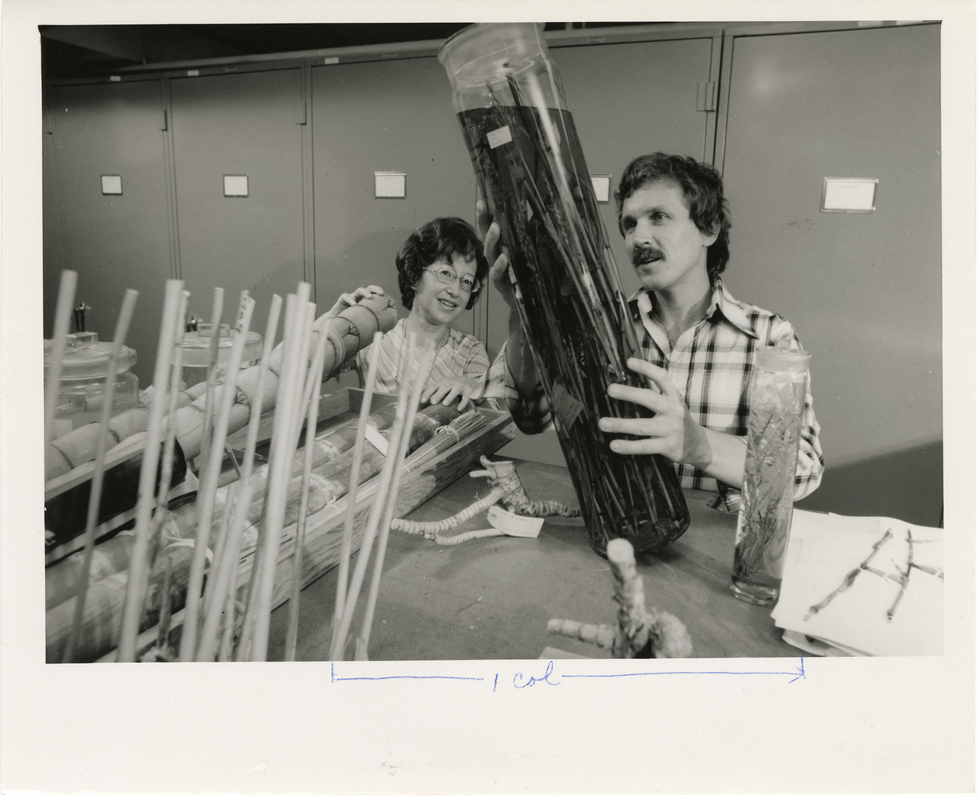 Cleofe Calderon, botanist, and Thomas Soderstrom, curator of grasses, examine bamboo samples at National Museum of Natural History in order to help the Brazilian government analyze the economic potential of enormous newfound stands of Amazonian bamboo.