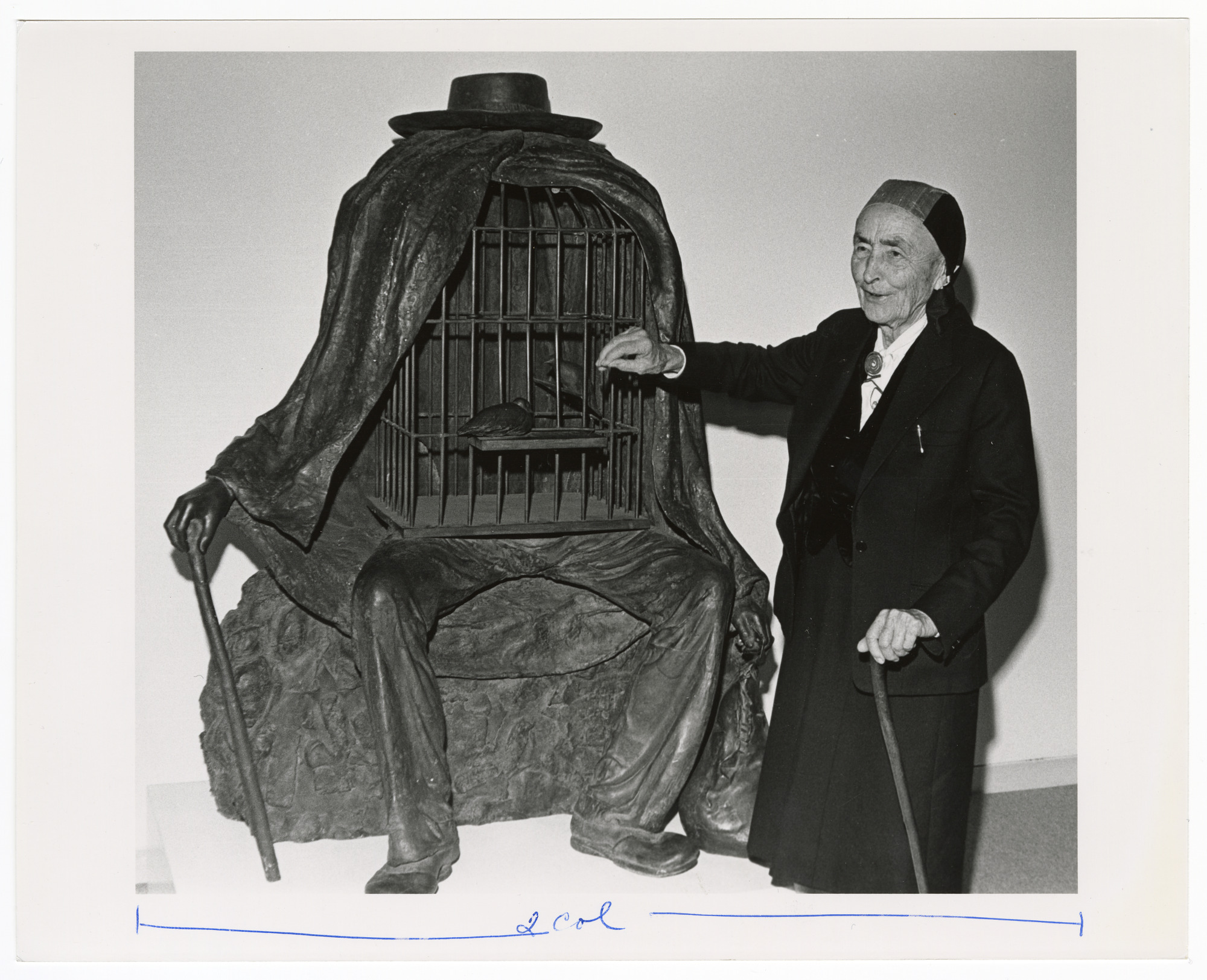 Caption from Torch: "Contemporary painter Georgia O'Keeffe visited the Hirshhorn on Friday, November 11, four days before her 90th birthday. She saw her own works among the Museum collection, and took time to sit with Rene Magritte's bronze, 'Delusions of Grandeur,' 1967."