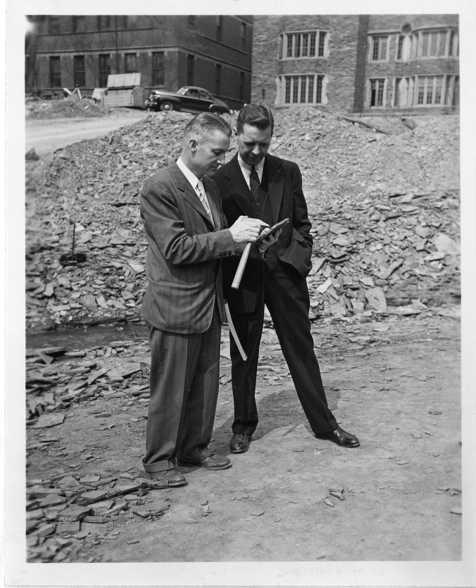left to right: Glenn Lowell Jepsen (1903-1974), Professor of Vertebrate Paleontology, Princeton University; and Julian Parks Boyd (1903-1980), Professor of History, Princeton University, and University Librarian. Caption for this 1946 photograph reads: "Professor Jepsen, Princeton University geologist (left) shows a fossil specimen of a coelacanth type fish (age about 175-million years) to Julian P. Boyd, university librarian. Thousands of specimens revealing details of anatomy never before seen in any members of this group, have been discovered in the excavation for the new university library."