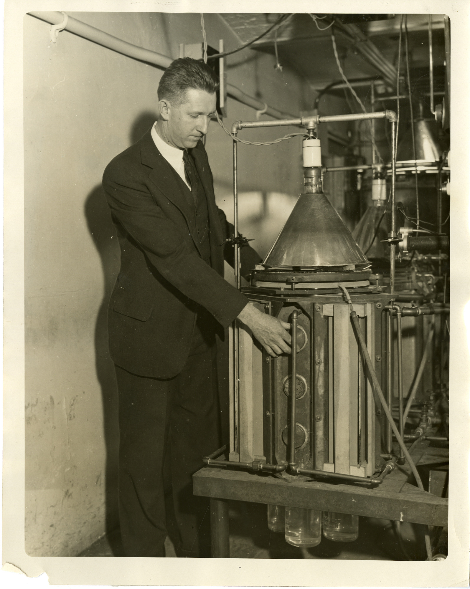 Dr. Earl Steinford Johnston (1889-1947), plant physiologist and head of the Division of Radiation and Organisms, Smithsonian Astrophysical Observatory, with one of the copper cages within which plants grew in a synthetic atmosphere, under electric light with glowing gas-tubes to add extra doses of certain special colors.