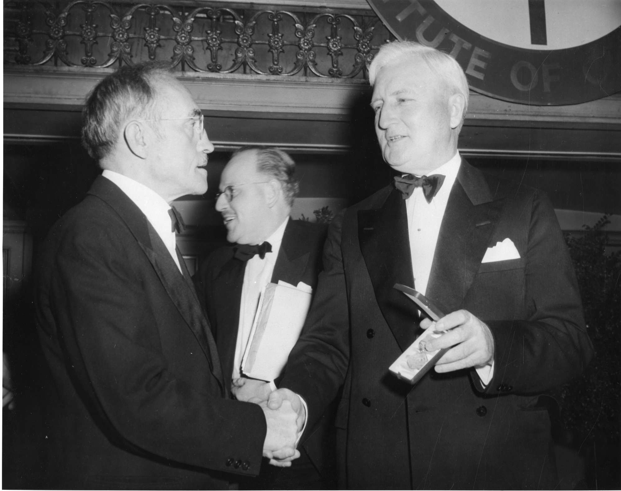 The Gold Medal of the American Institute of Chemists was presented on May 11, 1945, to John W. Thomas, Chairman of the Firestone Tire and Rubber Company, during ceremonies in the Deshler-Wallick Hotel, Columbus, Ohio. Mr. Thomas (right) held the Medal as he was congratulated by Dr. Gustav Egloff (1886-1955) (left), President of the Institute. Mr. Thomas was honored for his nearly forty years of leadership in rubber research, and for achievements made under his direction in the development and production of synthetic rubber. Dr. E. L. Luaces of Dayton, Ohio, chairman of the Miami Valley Chapter of the Institute, is visible in the background.
