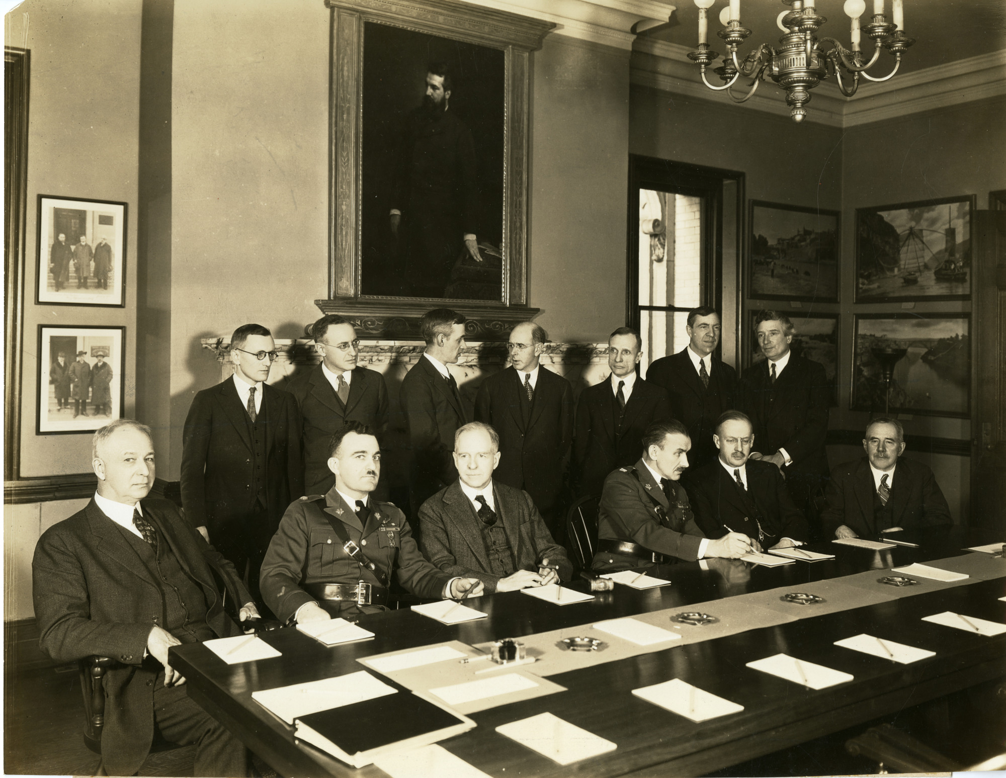 Members of the Advisory Committee of scientists directing arrangements for the National Geographic Society - U.S. Army Air Force Stratosphere Flight, 1934. Standing left to right: Dr. William George Brombacher (b. 1891), Mr. E. R. Weaver, and Dr. Fred Loomis Mohler (b. 1893), all of U.S. National Bureau of Standards; George W. Hutchison, Secretary, National Geographic Society; Captain Raymond Stanton Patton (1882-1937), Director, U.S. Coast and Geodetic Survey; Dr. Floyd Karker Richtmyer (1881-1939), Dean, Graduate School at Cornell University and Member of Research Council, National Academy of Sciences; and Dr. William Francis Gray Swann (1884-1962), Director, Bartol Research Foundation of the Franklin Institute, Swarthmore, Pennsylvania. Seated left to right: Dr. Frederick Vernon Coville (1867-1937), U.S. Department of Agriculture; Major William Ellsworth Kepner (1893-1982), U.S. Army Air Corps; Dr. Lyman James Briggs (1874-1963), Chairman, Director, U.S. National Bureau of Standards; Captain Albert William Stevens (1886-1949), U.S. Army Air Corps; Dr. Gilbert Grosvenor (1875-1966), President, National Geographic Society; and Dr. Charles Frederick Marvin (1858-1943), former Chief, U.S. Weather Bureau. The committee was advising on the project that resulted in launch of the "Explorer" hydrogen balloon on July 28, 1934.
