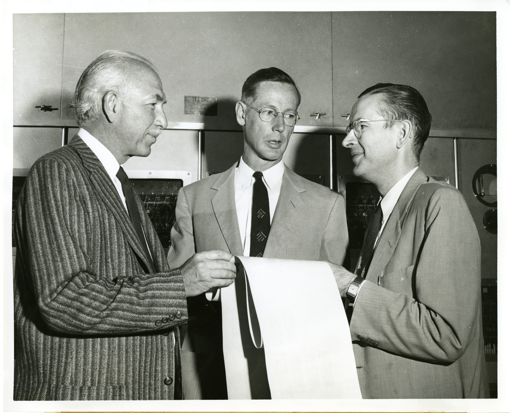 left to right: University of Illinois physics professors Peter Gerald Kruger (1902-1978), Donald William Kerst (1911-1993), and James N. Snyder, examine computations made by ILLIAC, the University of Illinois electronic computer.