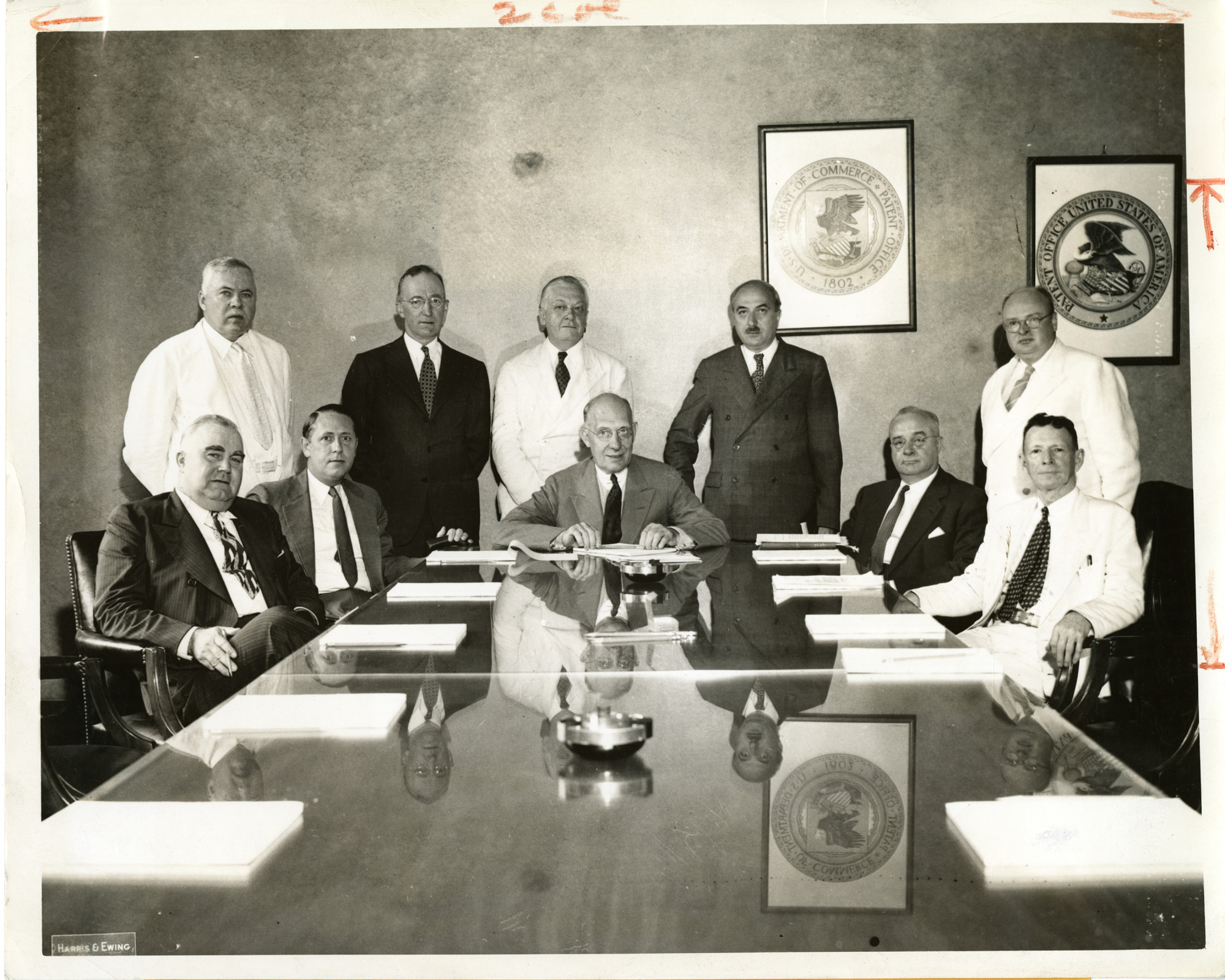 Participants in the first meeting of the National Inventors Council, August 6, 1940. Standing left to right: Dr. Fin Sparre (1879-1944), Director of Research, Du Pont Corporation; Dr. Webster N. Jones, Dean of Engineering, Carnegie Institute of Technology; Frederick Morris Feiker (1881-1967), Dean, George Washington University School of Engineering; patent attorney Lawrence Langner (1890-1962); Watson Davis (1896-1967), Director of Science Service. Seated left to right: Frederick Morrell Zeder, vice-president, Chrysler Corporation; Conway P. Coe, U.S. Patent Commissioner; Dr. Charles Franklin Kettering (Chairman of Council), President, General Motors Research Corporation; Dr. Thomas Midgley (1889-1944), vice-president, Ethyl Gasoline Corporation; Dr. William David Coolidge, Director of General Electric Research Laboratories.