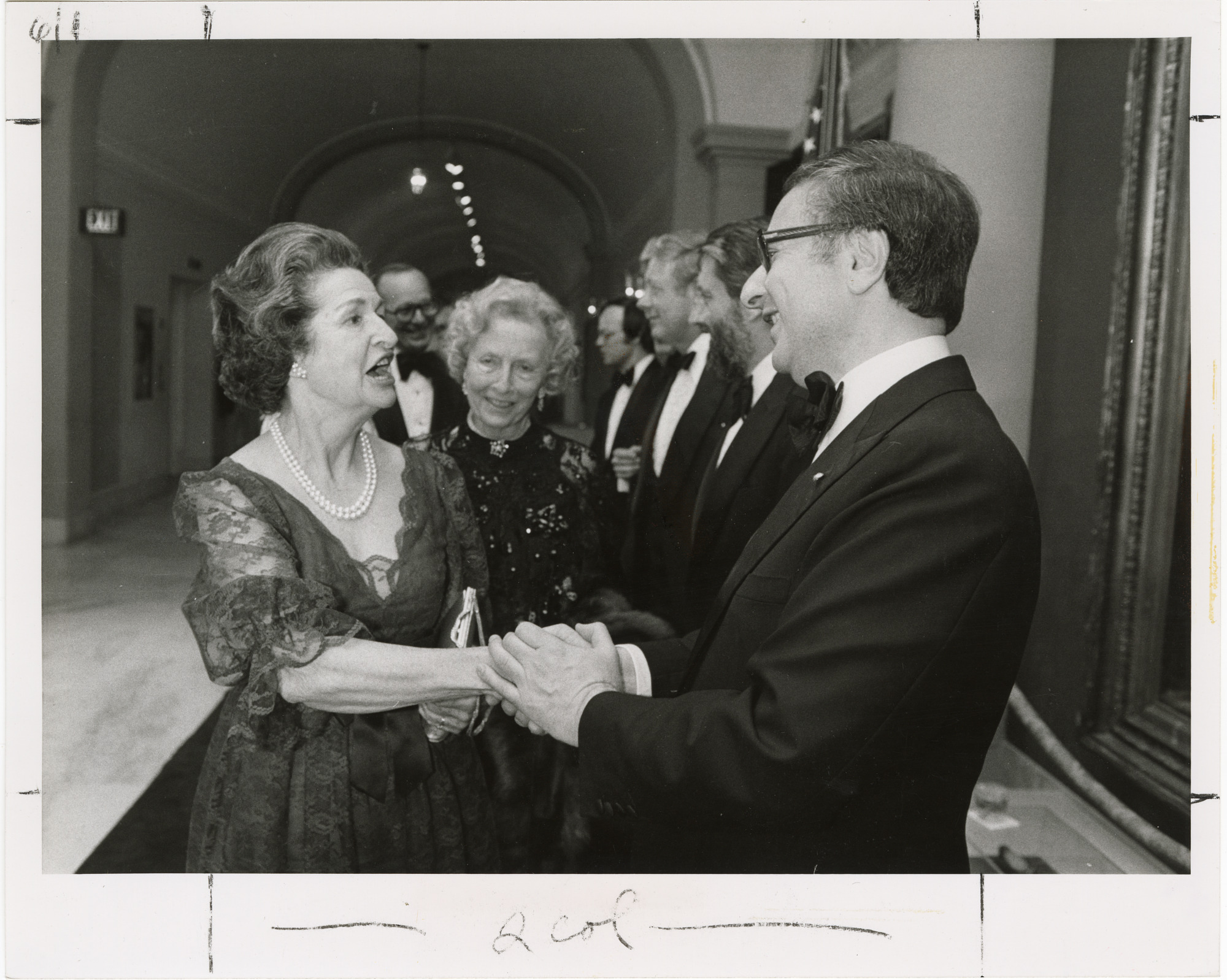 Marvin Sadik, director of the National Portrait Gallery, greets Lady Bird Johnson at a reception for the opening of "The TIME of Our Lives" exhibition at the National Portrait Gallery. The exhibition featured covers from Time magazine.