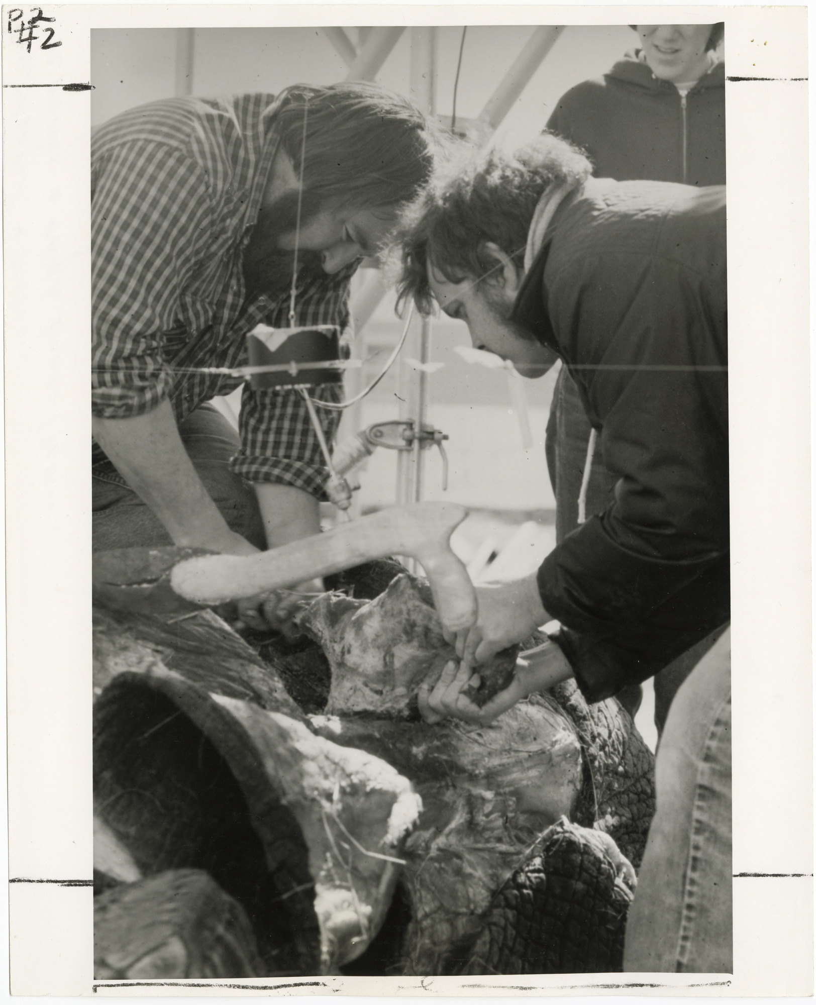 Dennis Stanford (left) of the National Museum of Natural History, and Richard Morlan of the National Museum of Man, Ottawa, Canada, remove a thigh bone from the carcass of an elephant using replicas of tools made from ancient mammoth bone. This was part of an experiment to determine if prehistoric hunters could use tools made from bones for hunting and butchering animals.